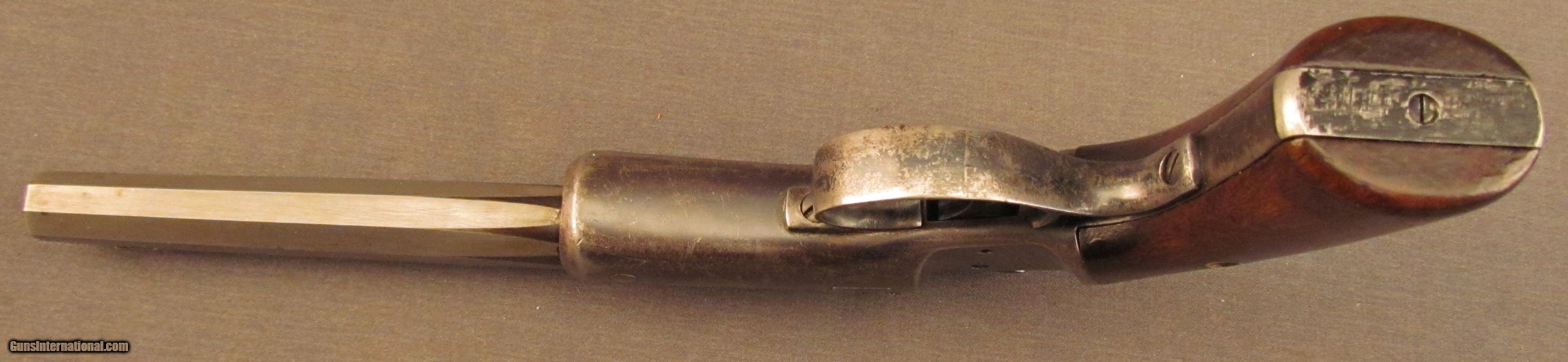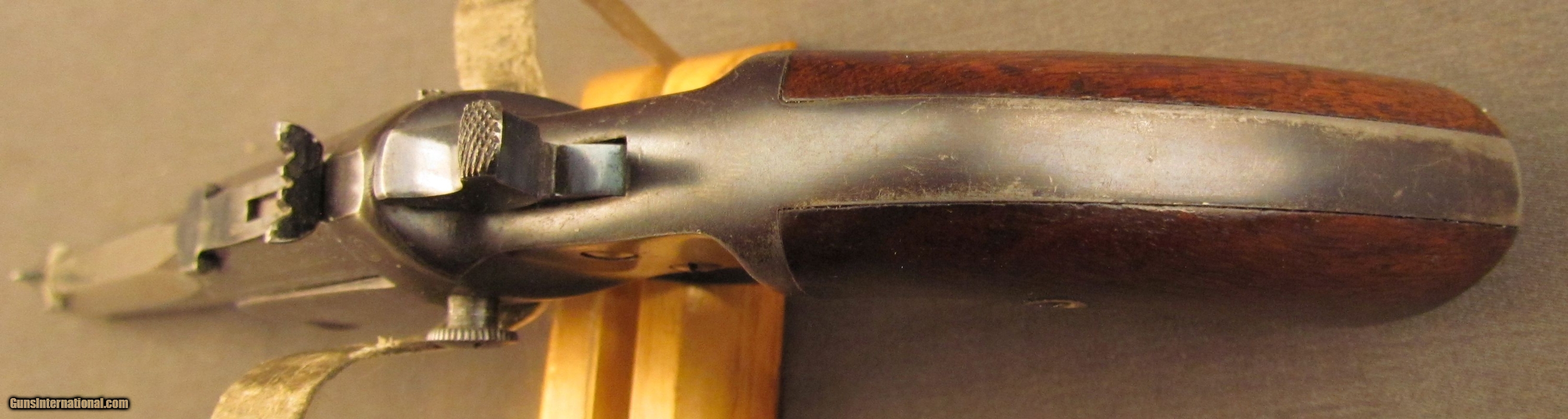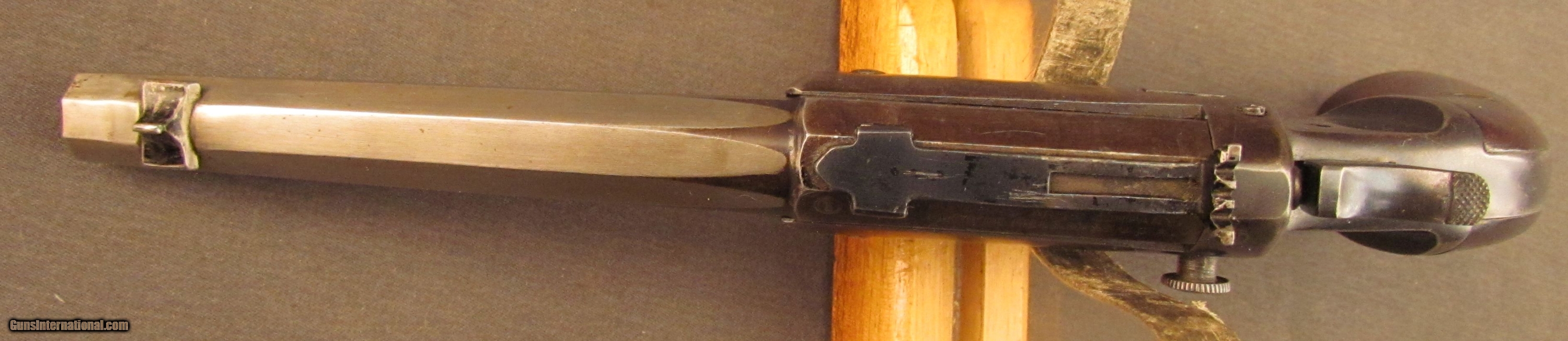 Description: Serial #A5569, .22 LR, 6” barrel with an excellent, bright bore. This pistol has been extensively modified and now has a stepped, full-length octagonal barrel, while the butt of the grip has been extensively reshaped so that the original thick metal butt now sits flush with the bottom of the walnut grips. The pistol has traces of original bllue on the barrel, most noticeably in narrow triangular slivers just ahead of the step where the barrel narrows down. The original rear sight is still installed (minus the elevator) and the frame retains about 70-75% of the original blue with the balance turned to a dull, pewter gray. Bright original fire blue remains on the hammer. The walnut grips are in fine shape with a thick added varnish finish over scattered light handling marks, and the remnants of a flaked black finish are present on the butt. The lock-up is still tight and the pistol is in fine condition as reworked. FFL or C&R SOLD Curio/Relic: Yes Manufacturer: Stevens Model: Target Serial Number: A5569 Caliber Info: .22LR Gauge Info: .22LR |