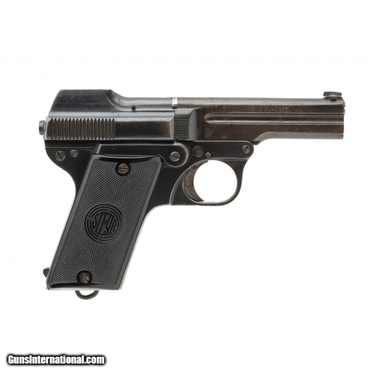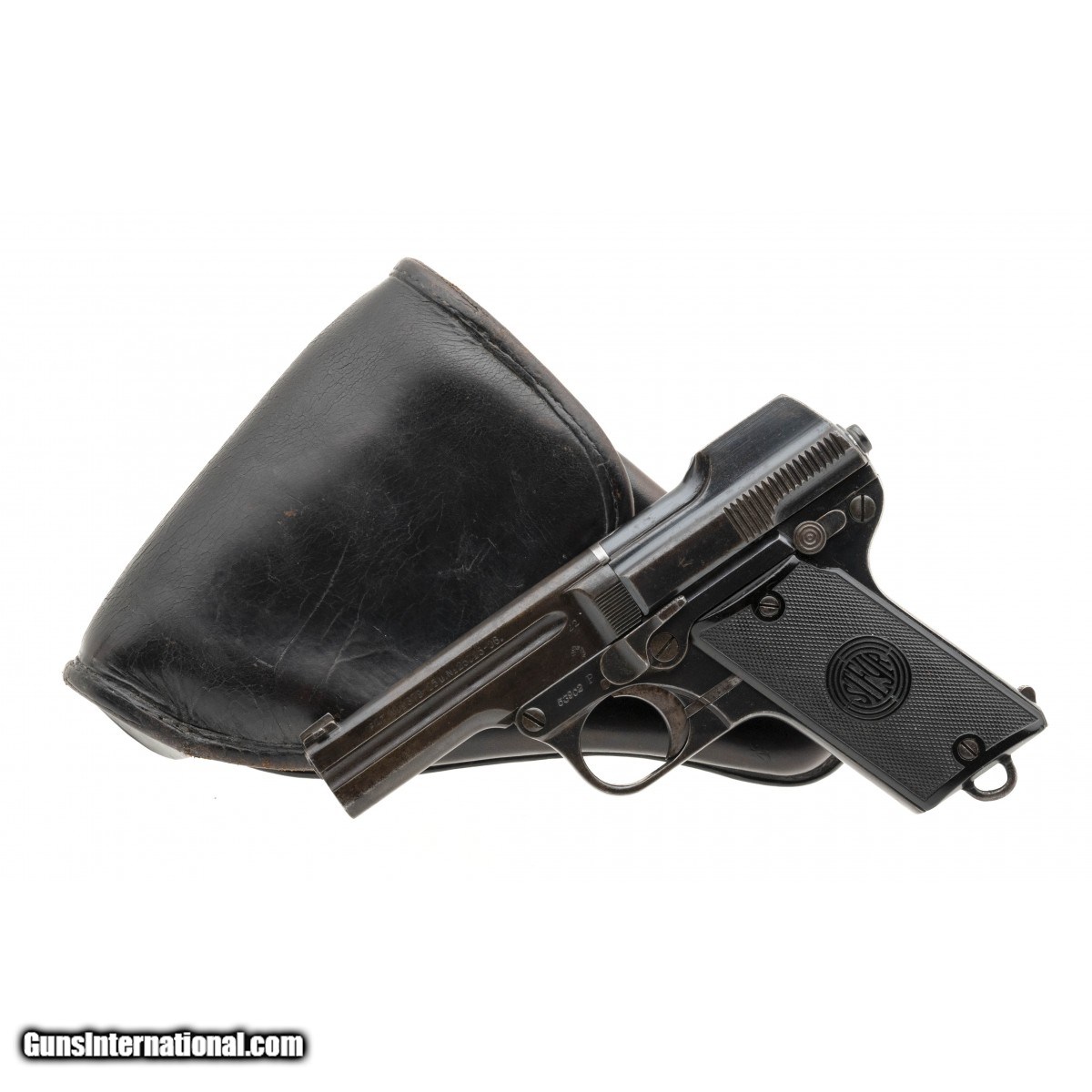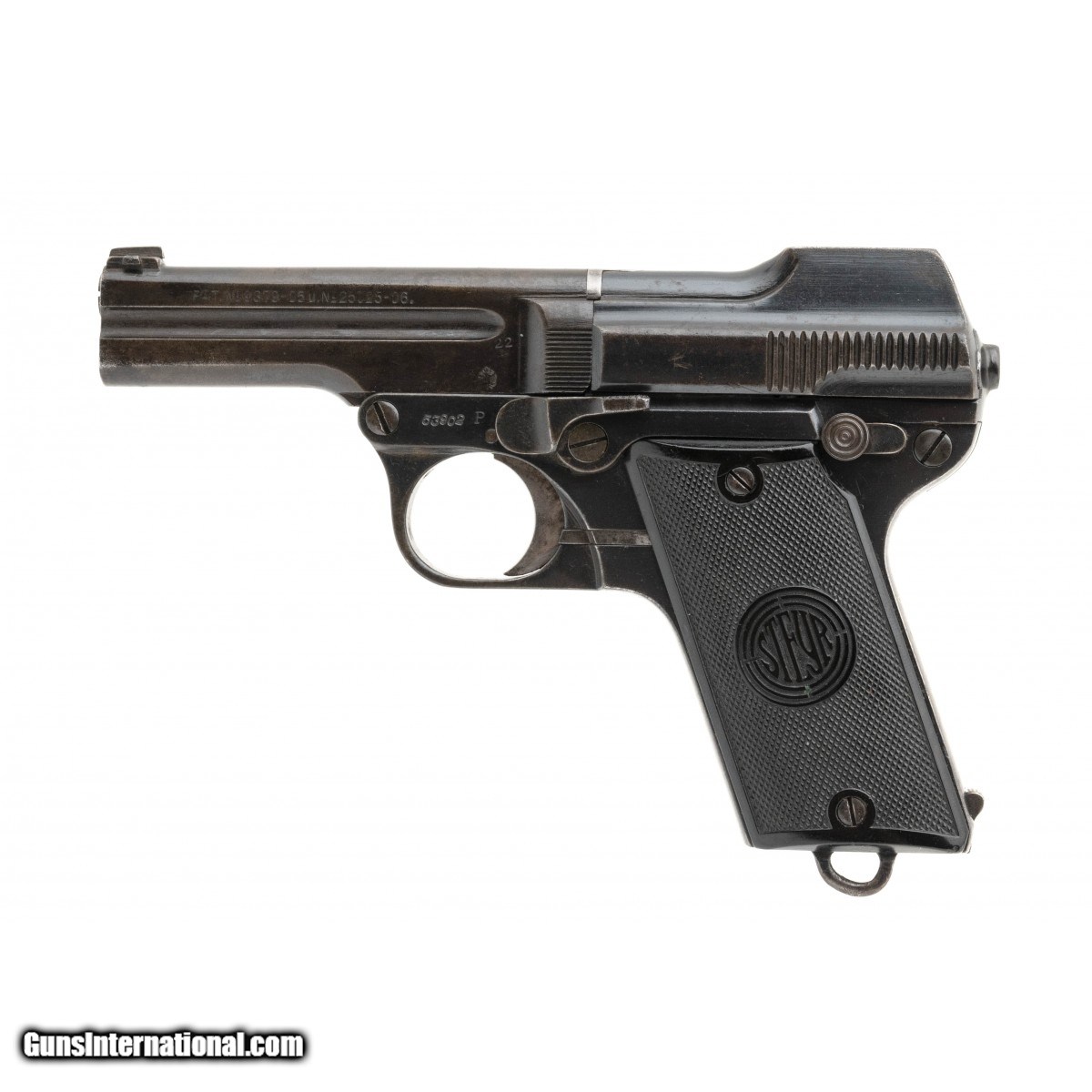 SN: 53902, made circa 1922, 32 ACP, 3.5"" Barrel.SN: 53902, made circa 1922, 32 ACP, 3.5"" Barrel. Barrel is turning to a grey patina while the frame and receiver retain 80% original blue. Bore is good with strong rifling noted. Back strap is marked ""S.W.8766"" This is an Austrian State Security Police issued pistol. Serial Numbers are matching except for the magazine. Comes with police issued holster that is in very good condition.