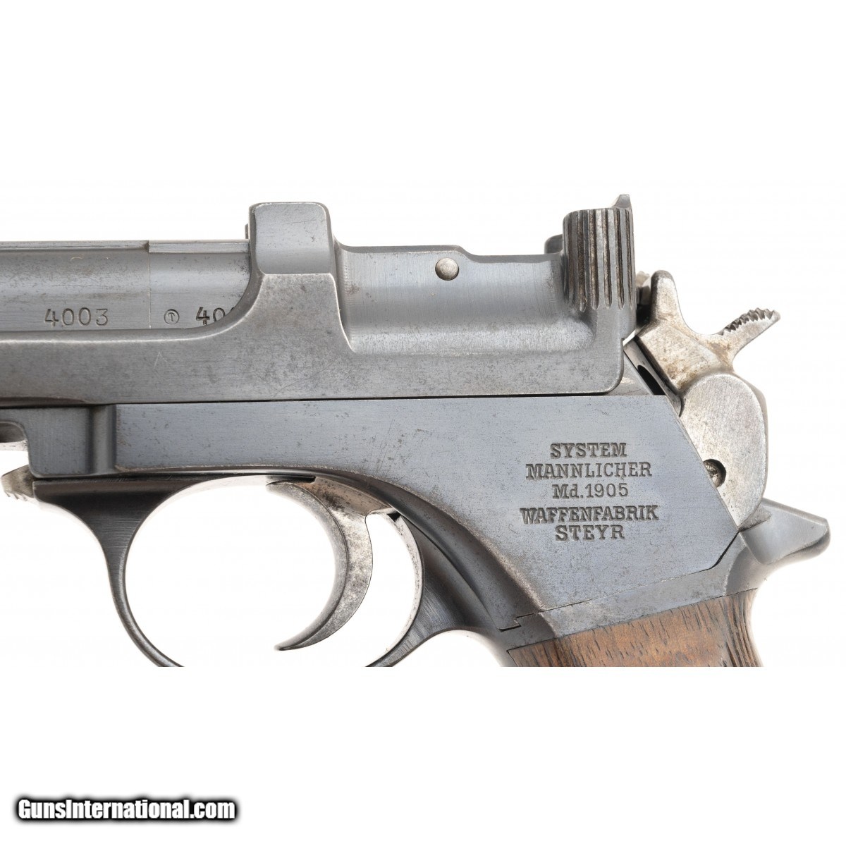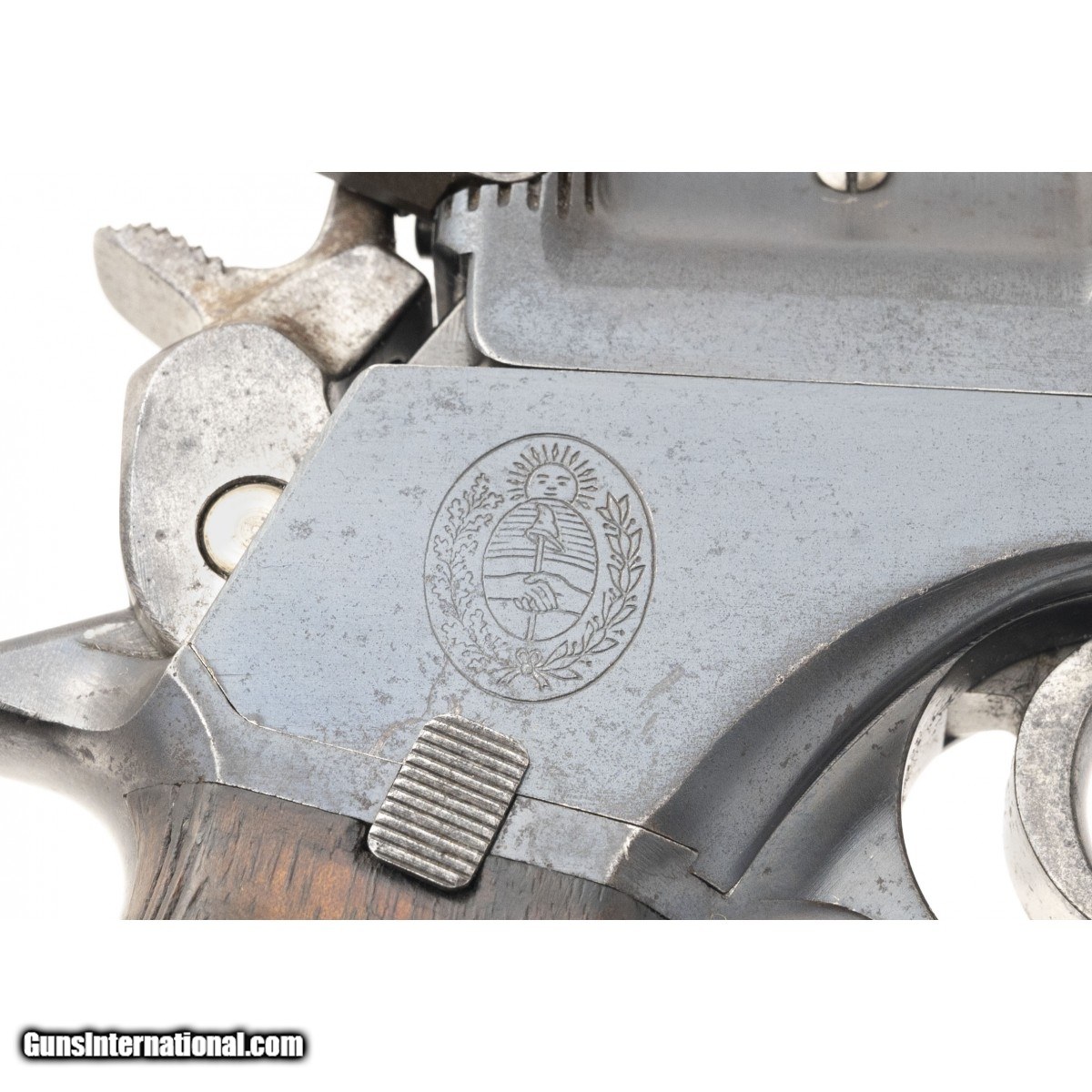 Description: " Argentine military pistol. This model bears the unground argentine crest on the right sideplate specifically for the province of Buenos Aires. The vast amount of imported 1905 Argentine crested pistols had the crest filed or ground. This is a rare pistol that escaped the import defacement . This grinding off of the crest was done in Argentina as the government required this when the pistols were exported. This practice was commonplace for many countries to ensure they could not be reissued. A rare unground Mannlicher in excellent condition. SOLD Curio/Relic: Yes |