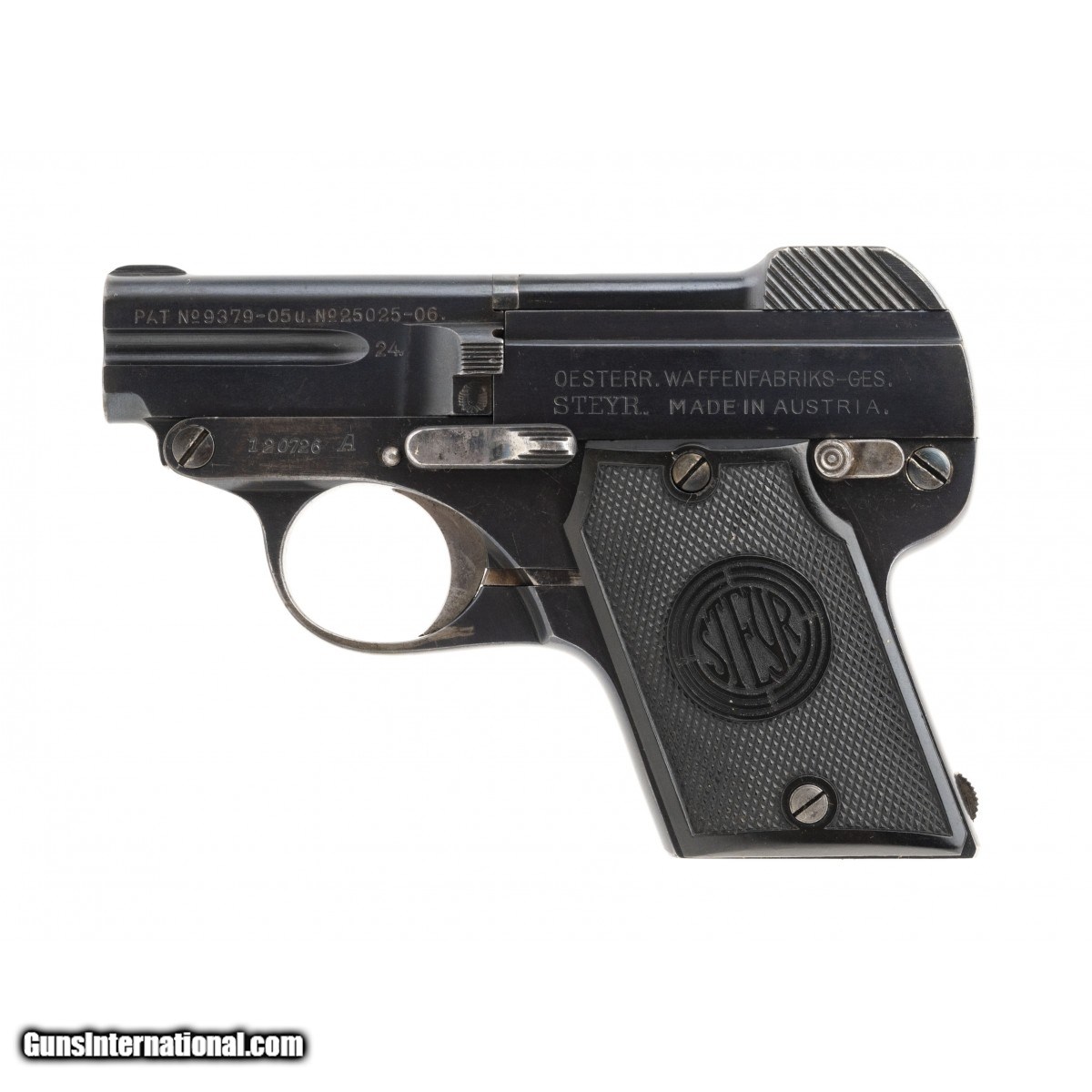 Description: " Austrian-made pocket pistol. The bore is in excellent and the actions work perfectly. The pistol has 95% of its original blue. The grips are perfect. Overall excellent condition! SOLD |