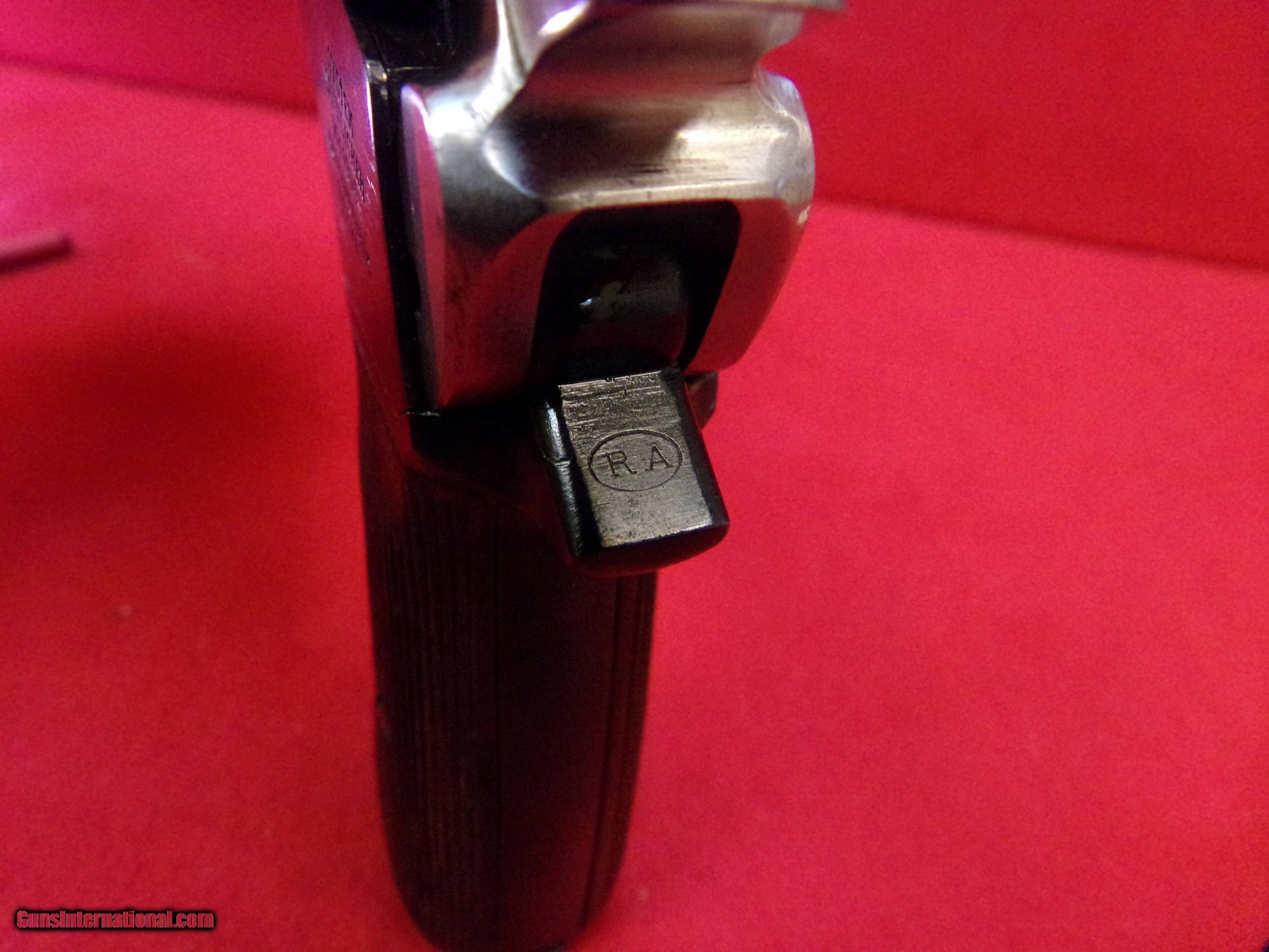 Description: Mannlicher Steyr Argentine Model 1905 7.65mm Semi Automatic Pistol. *SOLD*This pistol features grooved hardwood grips with a blued finish, as well as a blowback action and a safety switch located by the hammer. The Argentine crest has been ground off the right panel, and the surface has been polished and refinished, however a small area on the slide still shows grind marks, as seen in the photos. The pistol is in good condition, with a smooth action and a great bore and clean bolt face. The wood grips are slightly worn but have no cracks whatsoever. No Handgun Sales in Massachusetts. SOLD Curio/Relic: Yes Manufacturer: Mannlicher Steyr Model: Argentine 1905 Serial Number: 5728 Caliber Info: 7.65 |