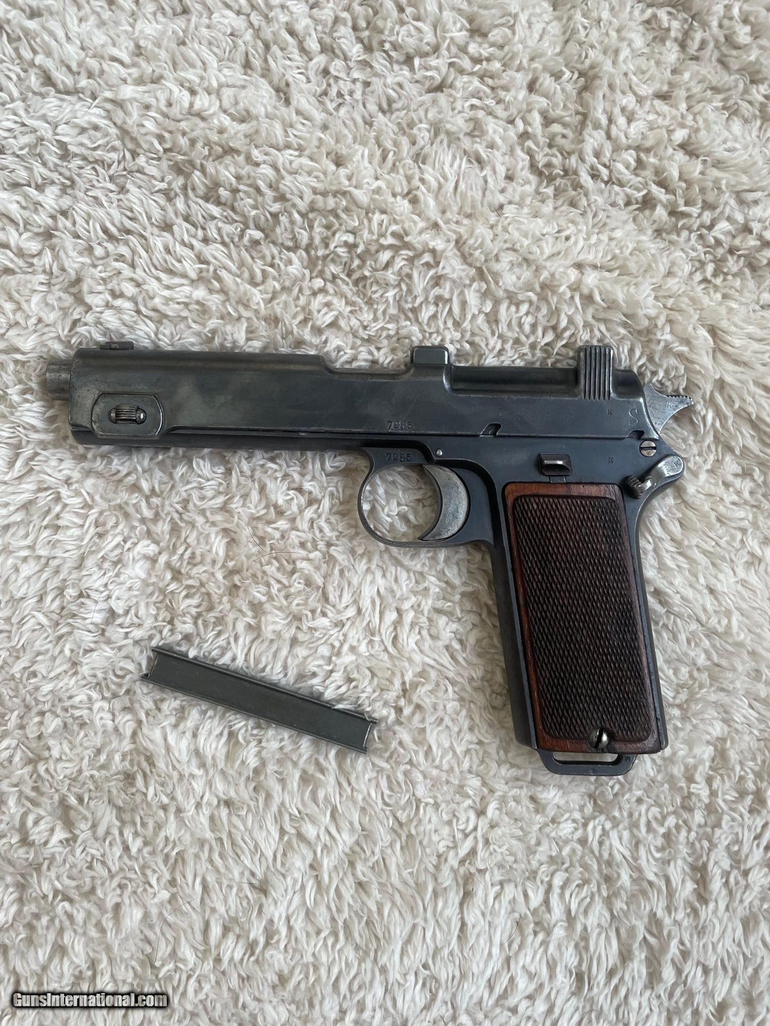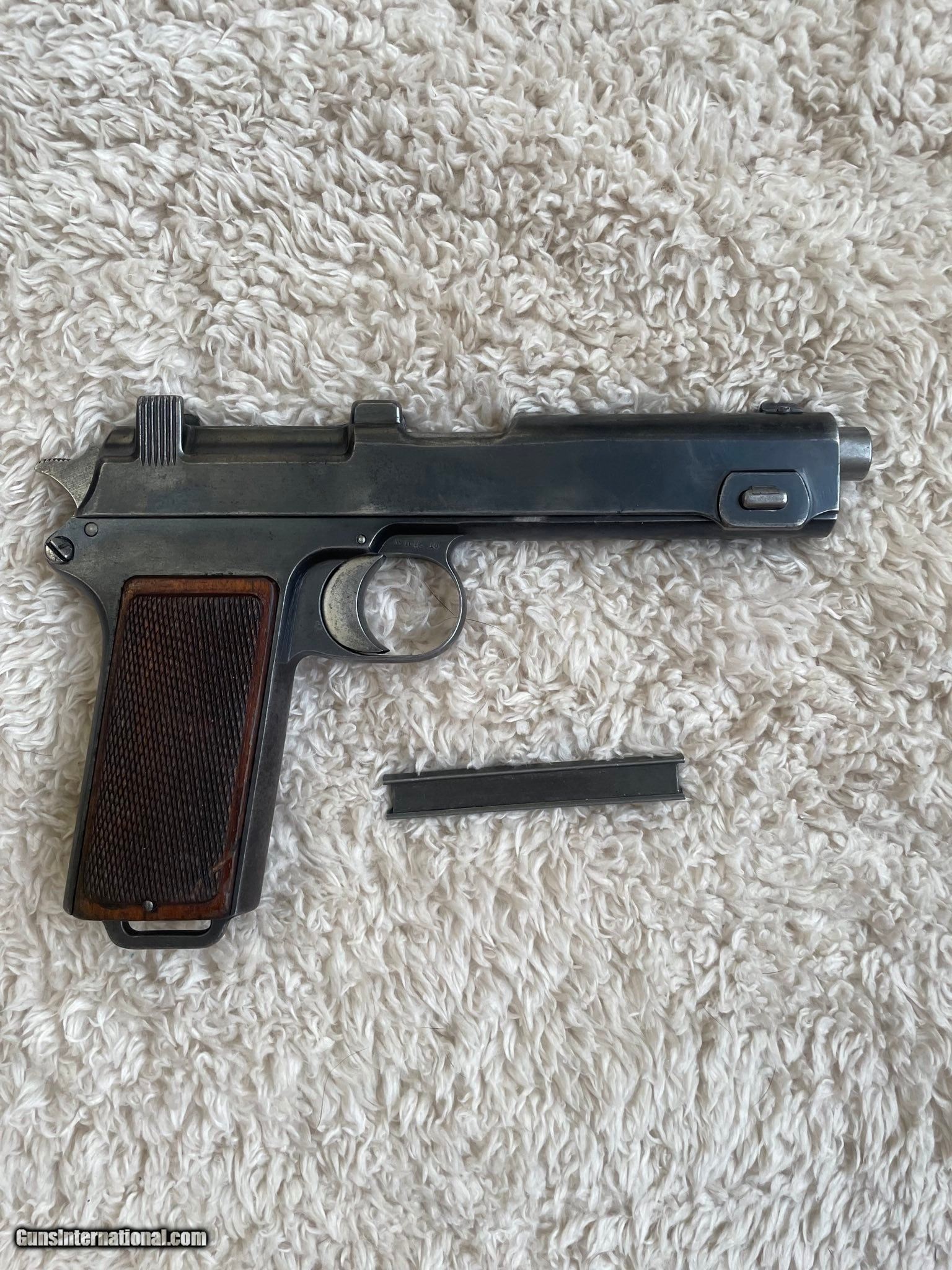 Description: Guns Listing ID: 490844 The Steyr-Hahn Model 1912 was a semi-automatic handgun that entered into Austria-Hungarian service prior to WWI. This handgun features an internal 8-round magazine that is fed via stripper clips. This is an iconic piece of history that rarely comes up. The handgun is chambered for 9x23mm Steyr and this pistol was manufactured in 1916 and does not feature any import markings. One 8-round stripper clip included. SOLD Manufacturer: STEYR Model: 1912 Caliber Info: 9x23MM STEYR Condition: Used - Non-Certified Barrels: 4 BARREL Finish: BLUE |