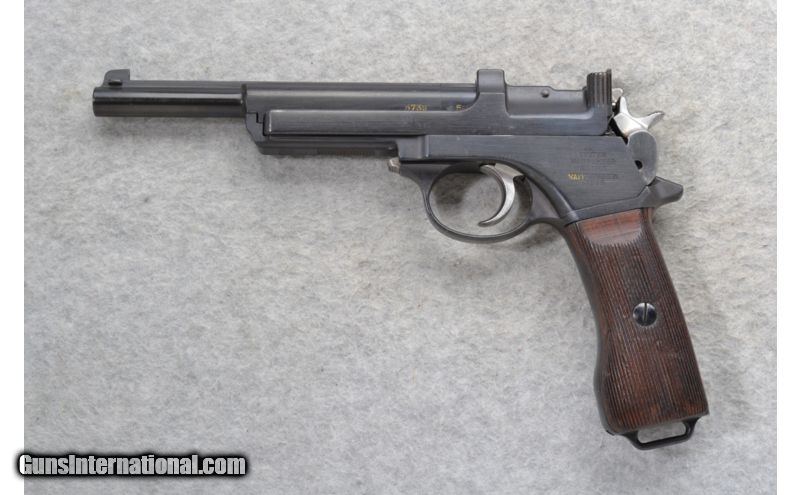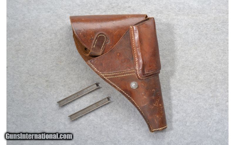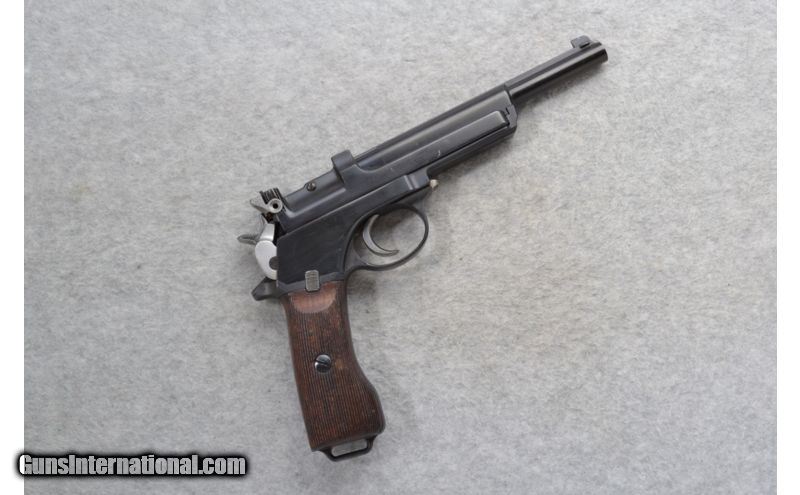 Description: This Steyr Mannlicher Model Argentine 1905 in 7.65mm cal. is in very good condition. It is single action and uses a blowback operating system to reload. It has a non-detachable magazine and can be loaded from the top with stripper clips. The crest on the right panel has been machined off. It has matching serial numbers of 5732. It comes with an original brown leather holster and two stripper clips. SOLD Curio/Relic: Yes Caliber Info: 7.65mm Cal. Chambers: 8 round stripper clips. Metal Condition: Very good. A few minor surface handling marks. Wood Condition: Very good. Light wear, handling / use marks. Bore Condition: Excellent. Barrels: 6.25 inches. Stock: Vertical ribbed/grooved walnut. Weight: 32 oz. Sights: Blade front. V notch rear. Item Location: Richfield, WI |