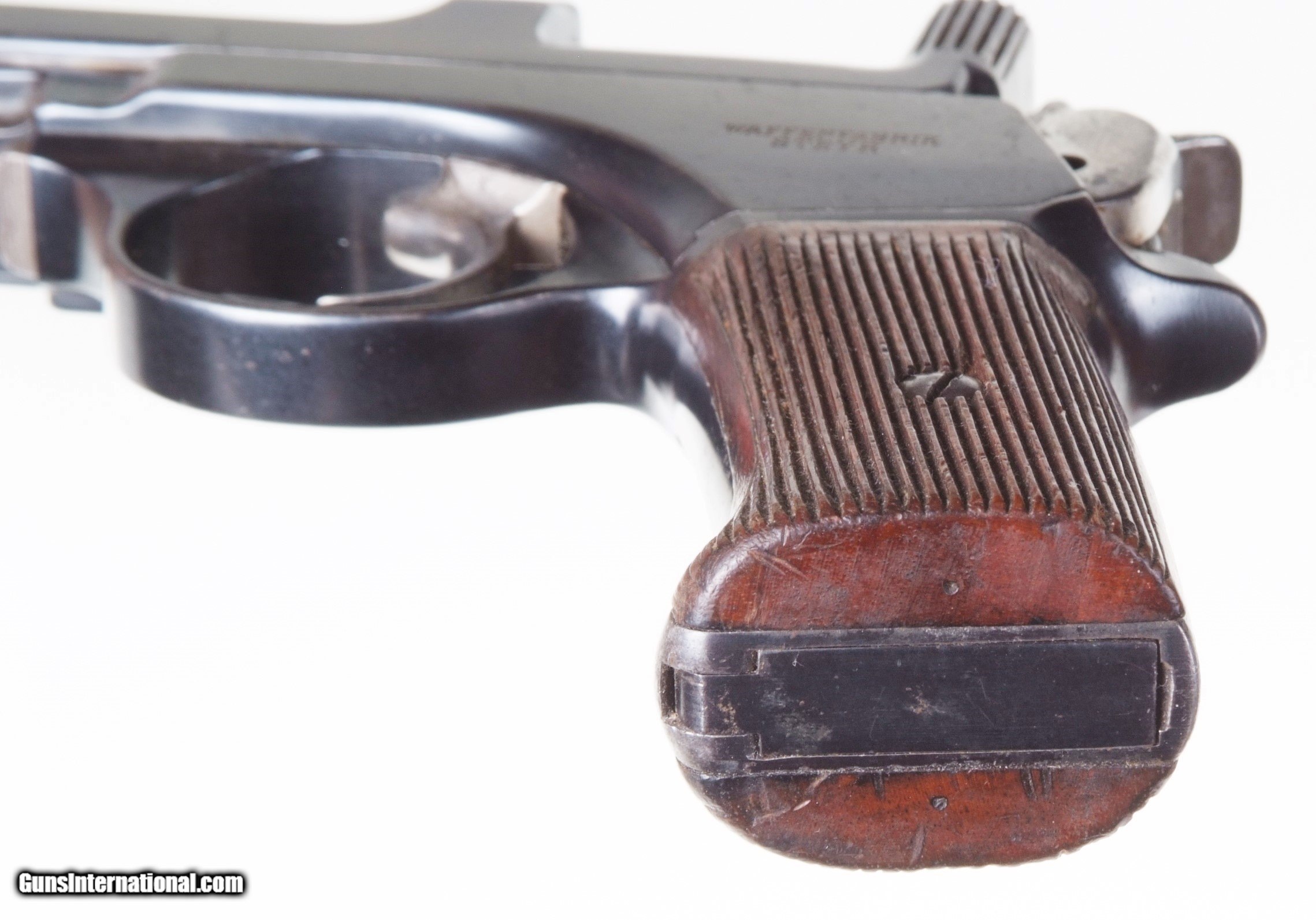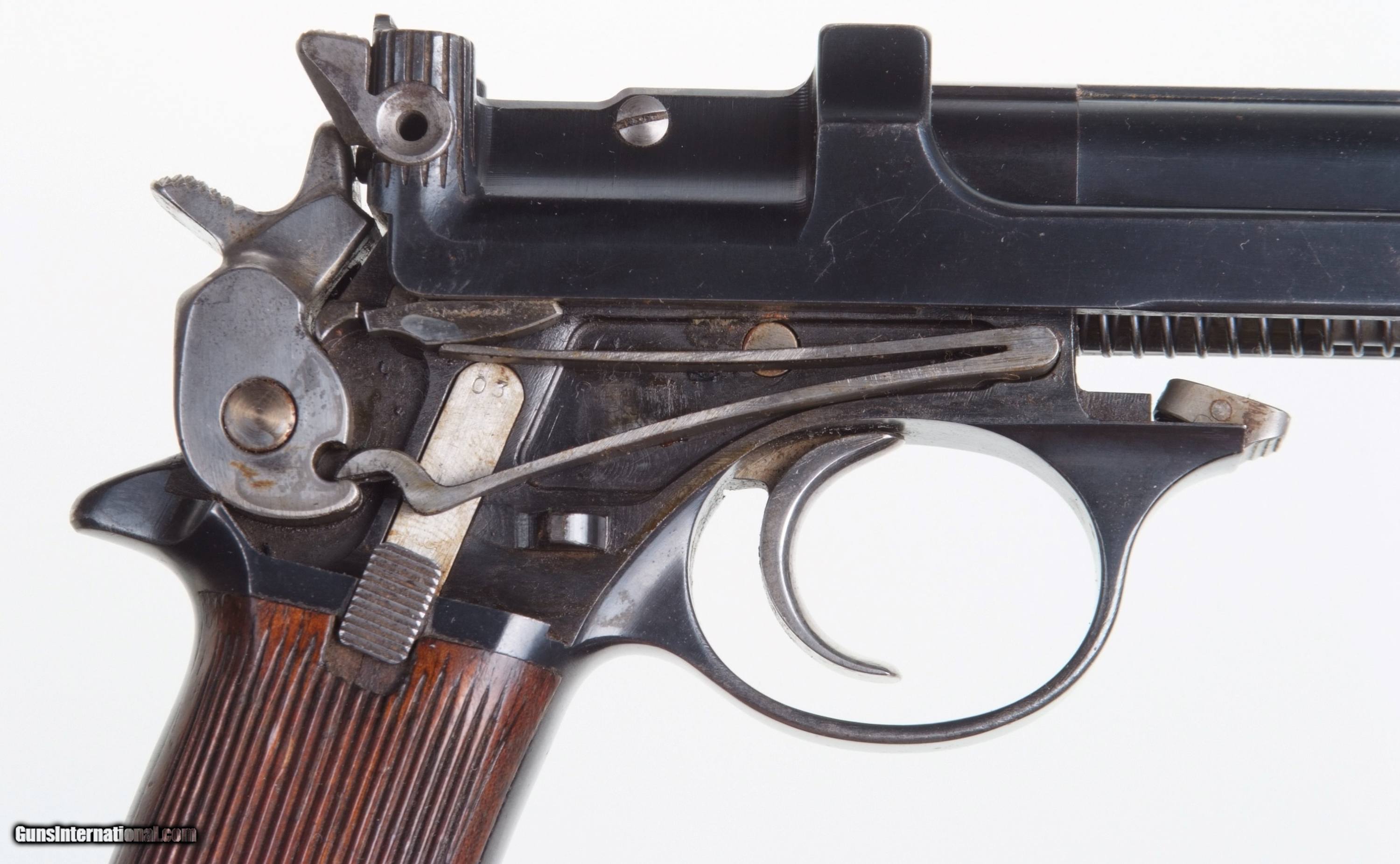 Description: Pocket model M1905 with a 4-3/4' bbl having drift adjustable front sight and fixed rear sight. Narrow trigger as often found in early production. Full SN is repeated on the left side of bbl, chamber, and on the bottom of the sideplate, just forward of the serrations. The sideplate has a split address: the left side is marked “WAFFENFABRIK / STEYR”; the right side is marked “SYSTEM / MANNLICHER”. A small oval proof, significance unknown, is on the left side of the bbl and repeated near bottom of the backstrap. Major parts are rust blued with the safety, hammer, trigger, and sideplate release remaining in-the-white. Screws are strawed. Removing the sideplate shows all matching small parts. Each of the grips, measuring 3-3/8" in length, is factory matched with a “03". PROVENANCE: Collection of Dr. Geoffrey Sturgess. Synopsis: Steyr Mannlicher M1905, Pocket Model, Short Barrel, Short Grip, seldom offered for sale, original condition. Condition: Approximately 90% orig rust blue with patchy oxidation on left muzzle and forward portion of left slide. Minimal freckling on front & backstrap. Small parts in-the-white with minor staining and toning. Grips with orig varnish and deeply cut serrations. Near mirror bore with strong rifling and perfect manual mechanics. Mannlicher made very few pocket M1905s, a real find for the serious collector. A HISTORIC INVESTMENT! ~~Insured shipping fee of $65; most packages shipped using FedEx 2nd Day.~~ SOLD Curio/Relic: Yes Manufacturer: Steyr Serial Number: 1803 Caliber Info: 7.65 mm |