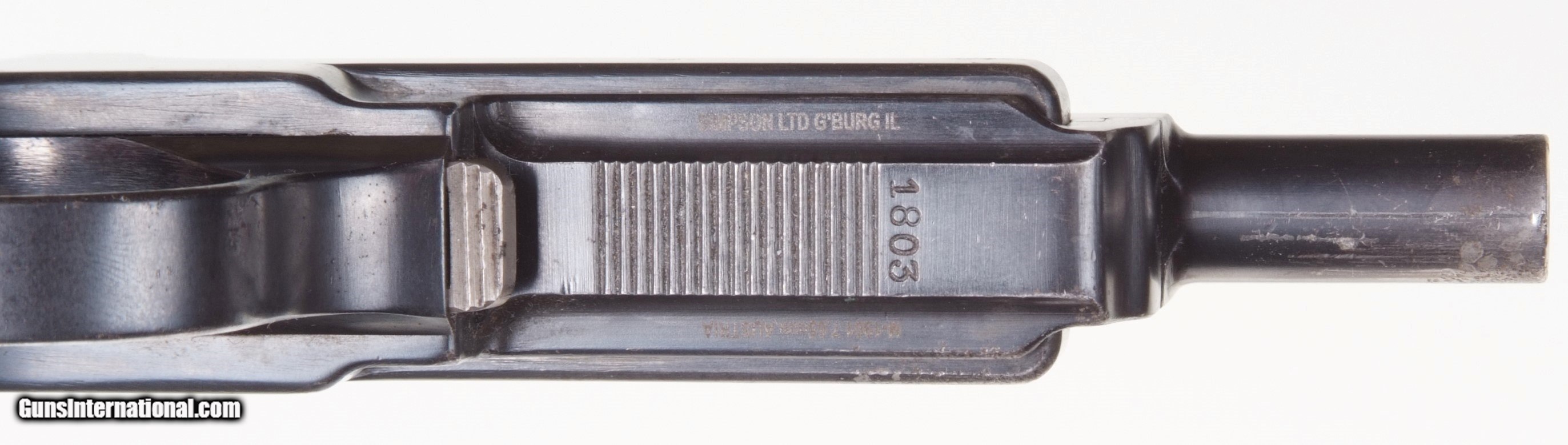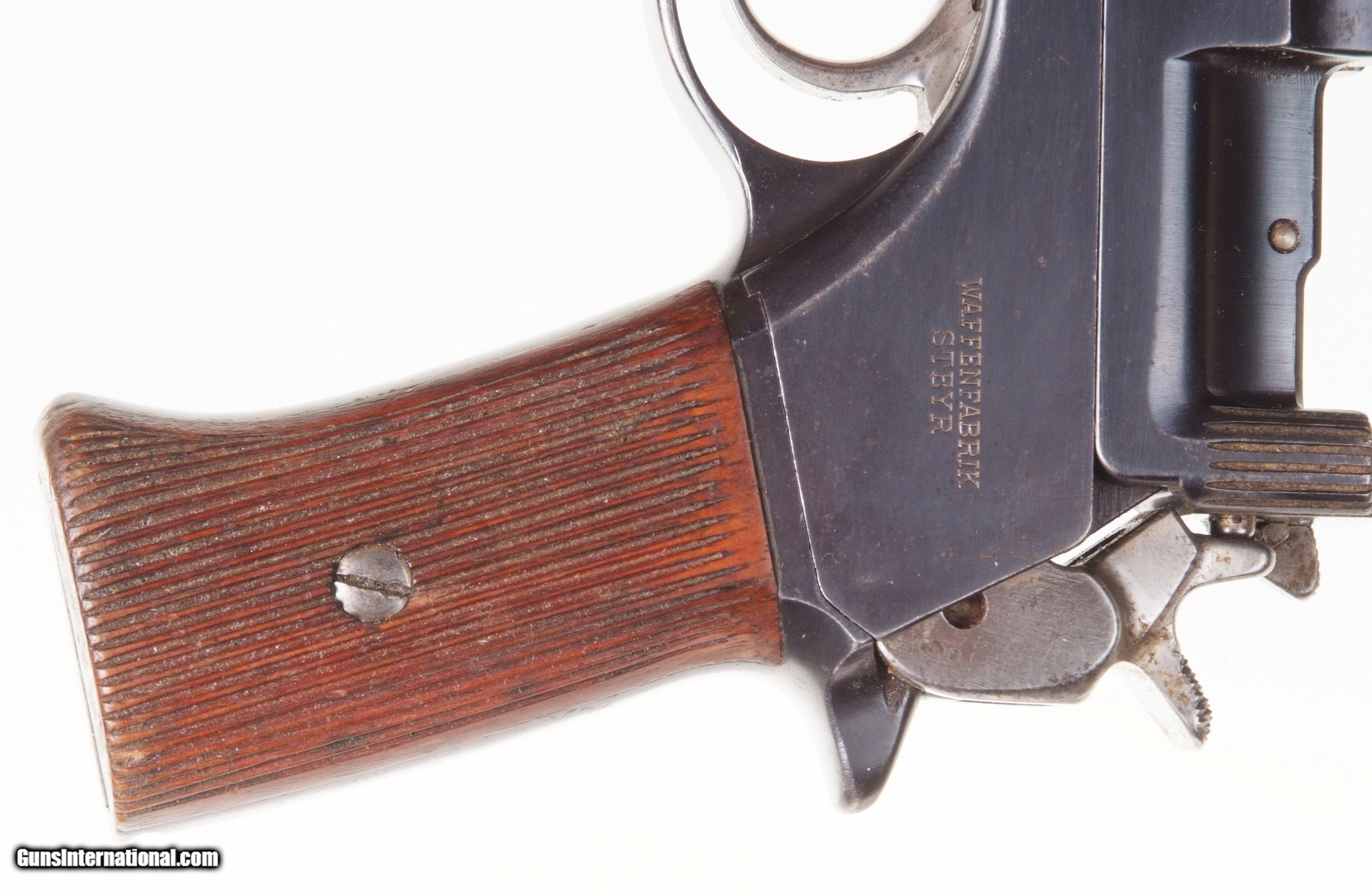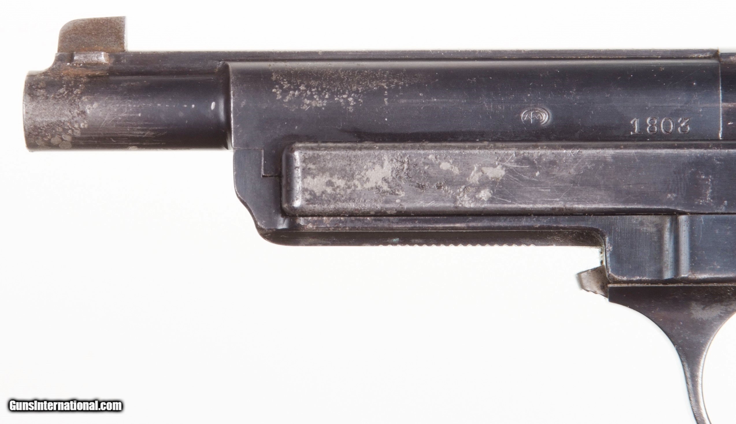 Description: Pocket model M1905 with a 4-3/4' bbl having drift adjustable front sight and fixed rear sight. Narrow trigger as often found in early production. Full SN is repeated on the left side of bbl, chamber, and on the bottom of the sideplate, just forward of the serrations. The sideplate has a split address: the left side is marked “WAFFENFABRIK / STEYR”; the right side is marked “SYSTEM / MANNLICHER”. A small oval proof, significance unknown, is on the left side of the bbl and repeated near bottom of the backstrap. Major parts are rust blued with the safety, hammer, trigger, and sideplate release remaining in-the-white. Screws are strawed. Removing the sideplate shows all matching small parts. Each of the grips, measuring 3-3/8" in length, is factory matched with a “03". PROVENANCE: Collection of Dr. Geoffrey Sturgess. Synopsis: Steyr Mannlicher M1905, Pocket Model, Short Barrel, Short Grip, seldom offered for sale, original condition. Condition: Approximately 90% orig rust blue with patchy oxidation on left muzzle and forward portion of left slide. Minimal freckling on front & backstrap. Small parts in-the-white with minor staining and toning. Grips with orig varnish and deeply cut serrations. Near mirror bore with strong rifling and perfect manual mechanics. Mannlicher made very few pocket M1905s, a real find for the serious collector. A HISTORIC INVESTMENT! ~~Insured shipping fee of $65; most packages shipped using FedEx 2nd Day.~~ SOLD Manufacturer: Steyr Serial Number: 1803 Caliber Info: 7.65 mm |