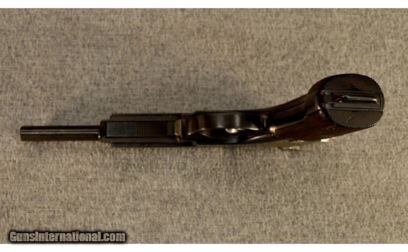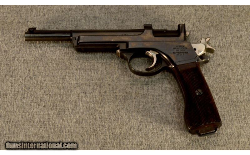 Description: This is a Steyr Mannlicher model 1905, a pistol designed by Ferdinand Ritter von Mannlicher in 1899 and originally produced in Austria as the model 1901. The 1905 is an improved version of the 1901 that the Argentine army purchased from Steyr in 1905. It has a non-detachable magazine that is loaded from the top with a stripper clip. 7.65x21 (.30 Luger) SOLD Metal Condition: 90% to 95% blue remaining with the Argentine crest ground off Wood Condition: Very good with slight handling marks Bore Condition: Clean with light rifling Barrels: 6 Butt Pad: Grooved wood Weight: 2 Lbs. 4 Oz. Sights: Pyramid front, V-notch rear Item Location: Glendale, AZ |