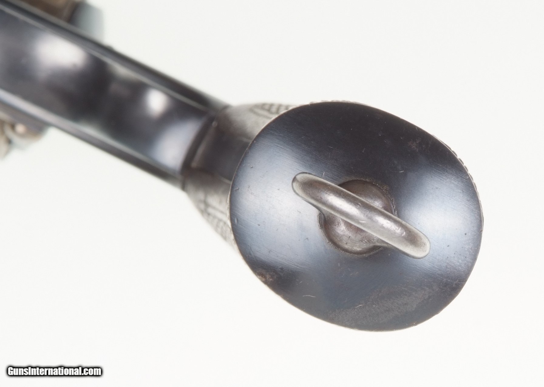 Description: Exceedingly rare Steyr M1893 gas seal revolver, 100 made in the early 1890s for the Austrian military trial of 1897. SN: 59. Cal.: 8mm. Arguably the most beautiful military revolver ever made, with a strawed cylinder, rust blued barrel and frame, and a fire blued front sight. Although there were several variations within this limited production, all incorporated a gas seal mechanism in which the cylinder face was pressed against the forcing cone upon hammer fall. This eliminated the pressure drop from escaping gas and was an important development that laid the groundwork for the smaller and more commonly encountered Nagant M1895. According to Moetz and Schuy, Von Ursprung der Selbstladepistole, a biblical reference of early Austrian pistols, pg 440, all 100 revolvers were sent to the Austrian military to be tested against tested the Salvator Dormus, Mannlicher M1894, and Roth Theodorovic. At least one of the Steyr M1893s, #71, was marked with the Austrian Wn/97 acceptance. This matching example has a 5 5/8” half round/half octagon barrel with a pinned, half-moon, fire blued front sight and fixed rear sight. SN 59 is on the left side of the barrel and frame. Sideplate is marked “WAFFENFABRIK /STEYR”. Strawed cylinder marked with an Eagle/N on the front face, reflecting later testing in Germany. Balance of the revolver is rust blued with checkered walnut panels and swiveling lanyard ring. Condition: Excellent overall, with 95-97% bright original rust blue with comparable condition strawed cylinder. Small chip in left side of forcing cone. Perfect bore and manual function. One of the rarest and most impressive of Steyr’s handguns, with military pedigree, in outstanding SOLD Antique: Yes Manufacturer: Steyr Model: Model 1893 |