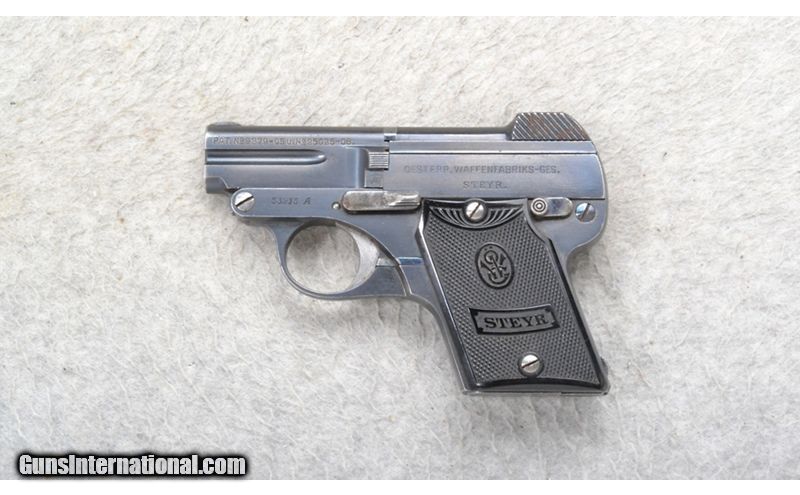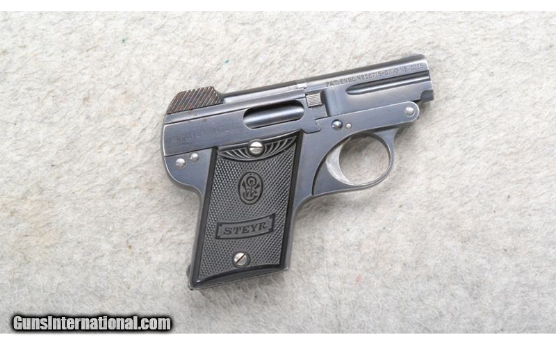 Description: This Steyr Model N. Pieper Patent is a right hand semi-auto pistol in .32 Auto Cal. It has a 2 inch barrel with a rear serrated slide. A blade front sight and notch rear sight. The grip is a checkered hard black plastic with Steyr. Serial Number 53215A. .32 Auto SOLD Chambers: 5 shot. Metal Condition: Good. A few minor light surface rust spots. Bore Condition: Very Good. Barrels: 2 inch. Weight: 12 oz. Sights: Blade front. Notch rear. Item Location: Richfield, WI |
