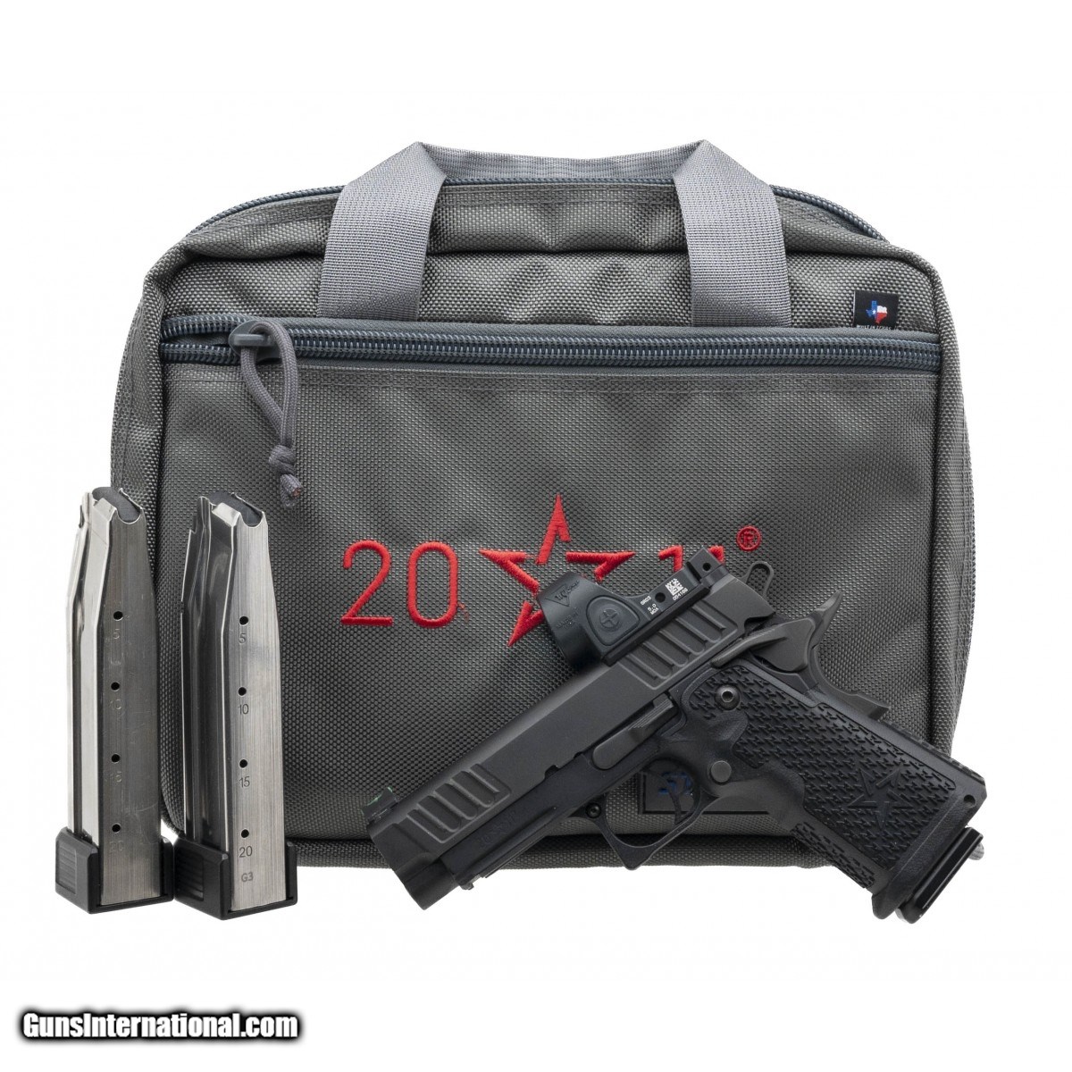 Description: "SN:C2212723. Modern production. 9mm with a 3.9"" Bull barrel. Bore is in excellent Condition. Texas made carry size 2011 double stack pistol. Finish and grips are in excellent condition. fiber optic front sight and Trijicon SRO Red dot. Overall condition is excellent. Comes with Staccato range bag 2 extra magazines. SOLD |