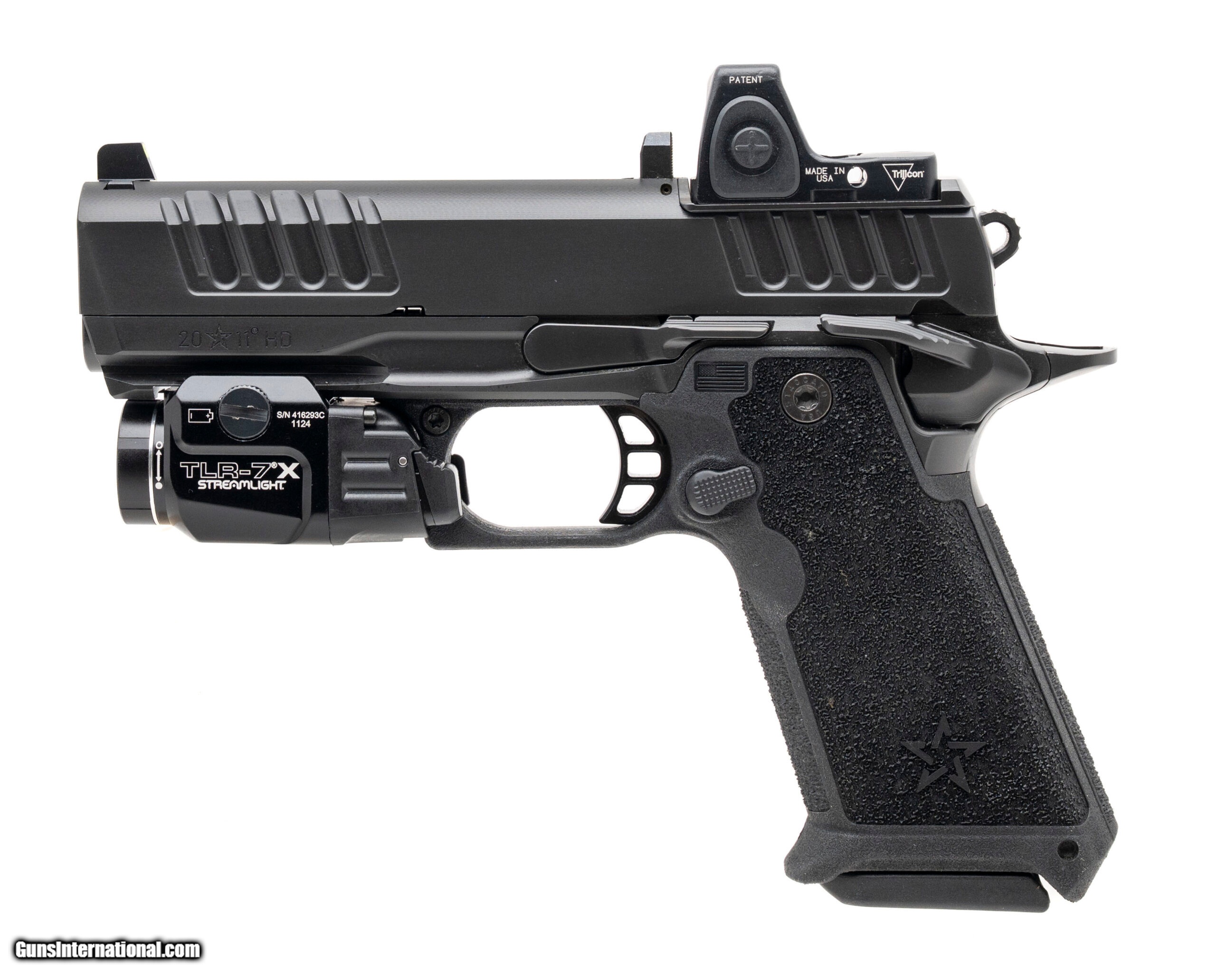 Description: "SN: P4-03355. Modern production, 9mm with a 4"" bull barrel. Compact 2011 pistol with a Trijicon RM06 red dot optic co-witnessed w/combat cut tall sights. Overall condition is excellent. Comes equipped with a Streamlight TLR-7 X flashlight. SOLD |