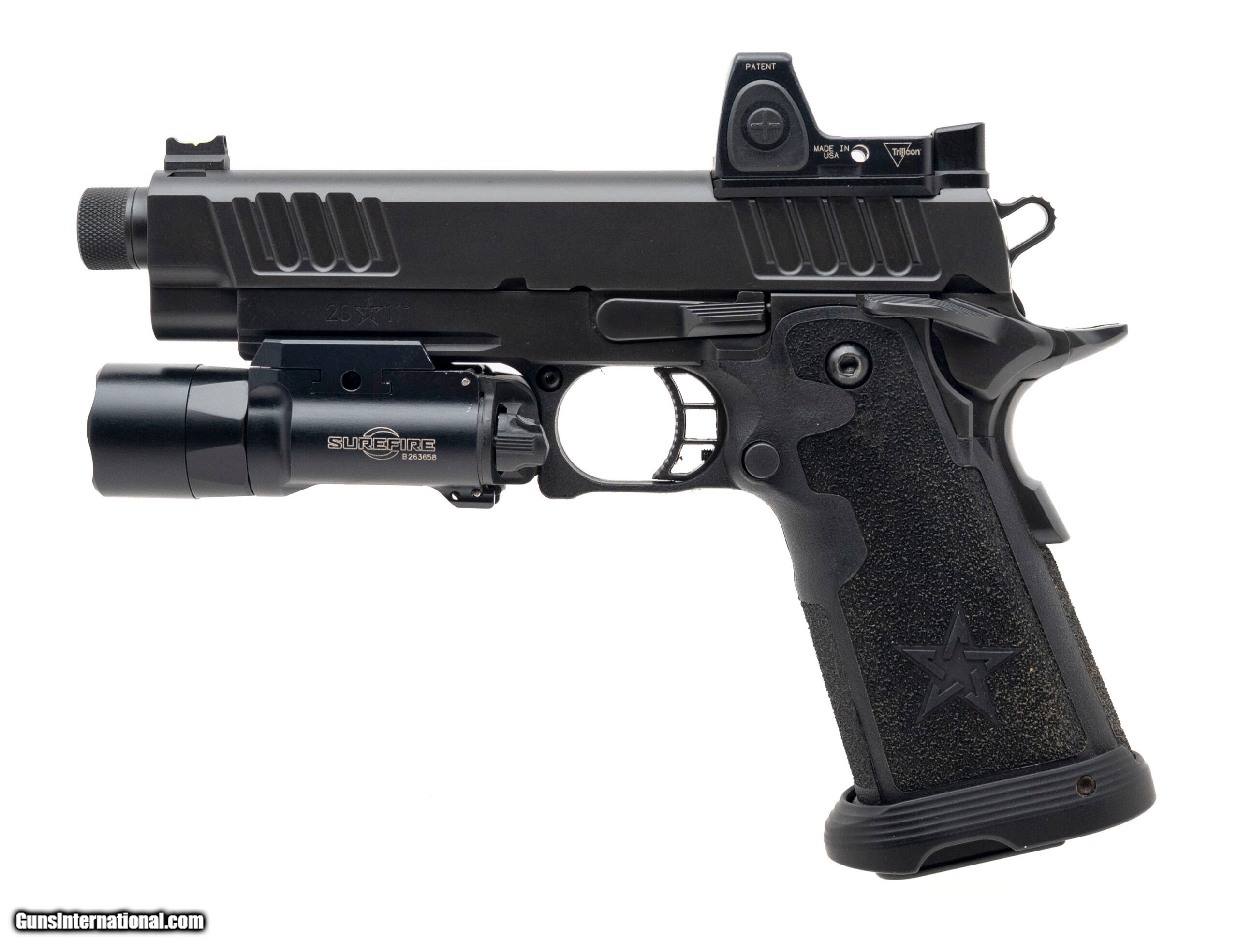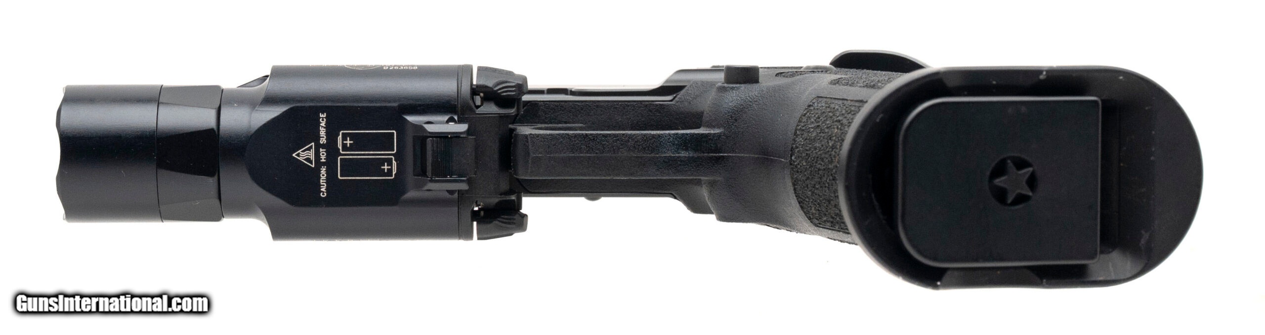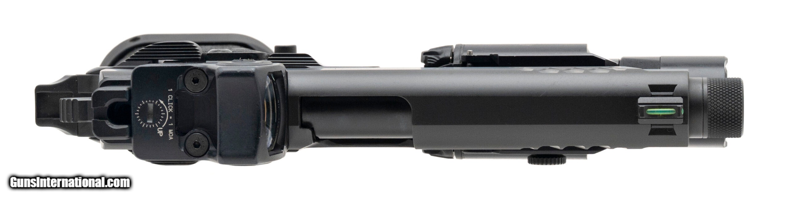 Description: "SN: P2141562. Modern production, 9mm with a 4.4"" threaded DLC barrel. Duty size 2011 with a Trijicon RMR red dot optic, SureFire X300 Turbo flashlight, and flared magwell. Overall condition is near excellent. SOLD |