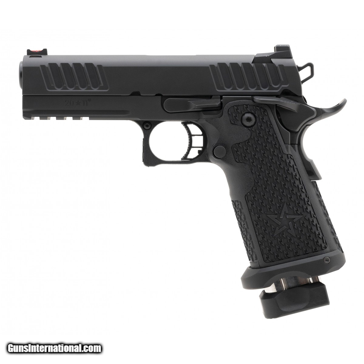 Description: " SN: TX14590. Premium double stacked 1911 with 4"" DLC bull barrel with forward serrations, ambidextrous-safety and magwell with fiber optic front sight. Overall excellent condition. Comes with Staccato range bag and extra magazines. SOLD |