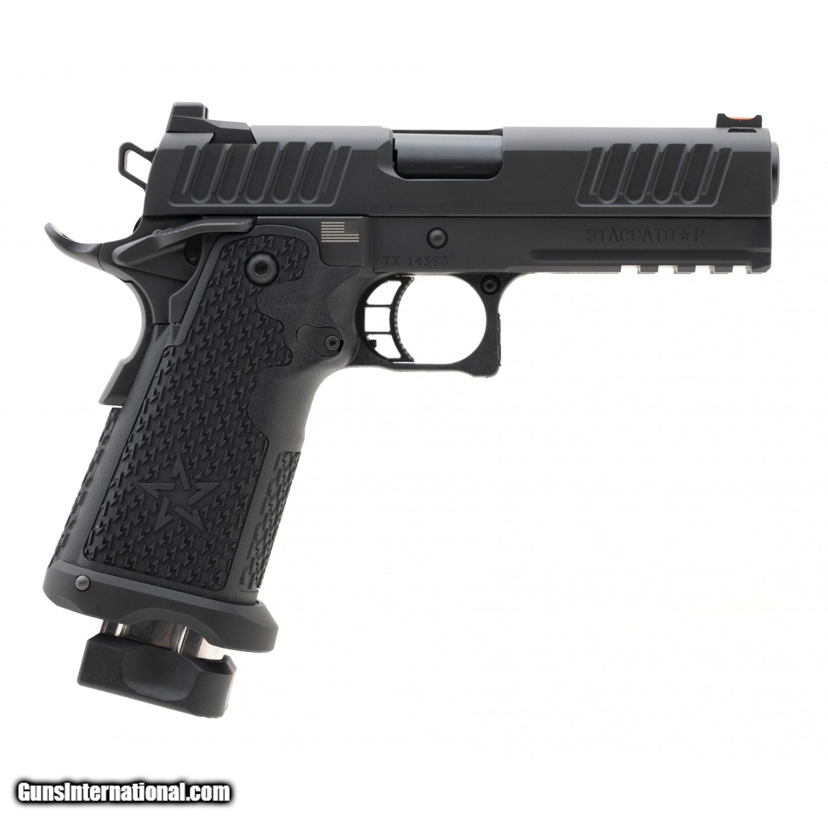 SN: TX14590. Premium double stacked 1911 with 4"" DLC bull barrel with forward serrations, ambidextrous-safety and magwell with fiber optic front sight. Overall excellent condition. Comes with Staccato range bag and extra magazines.