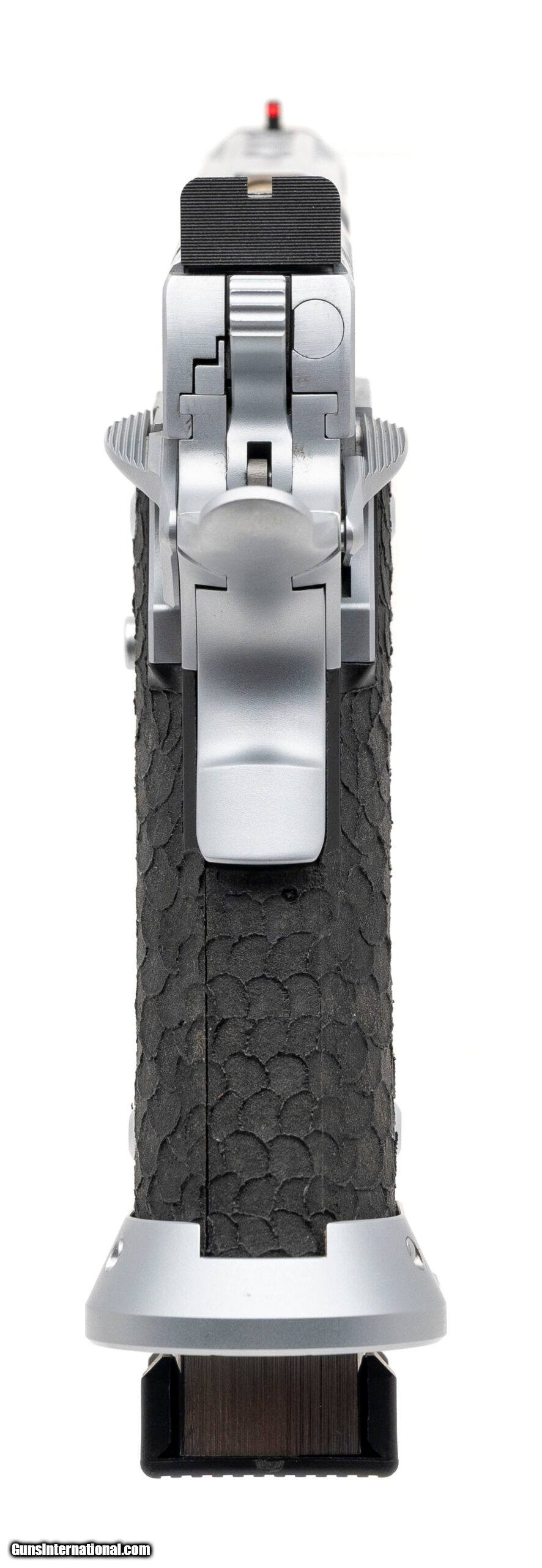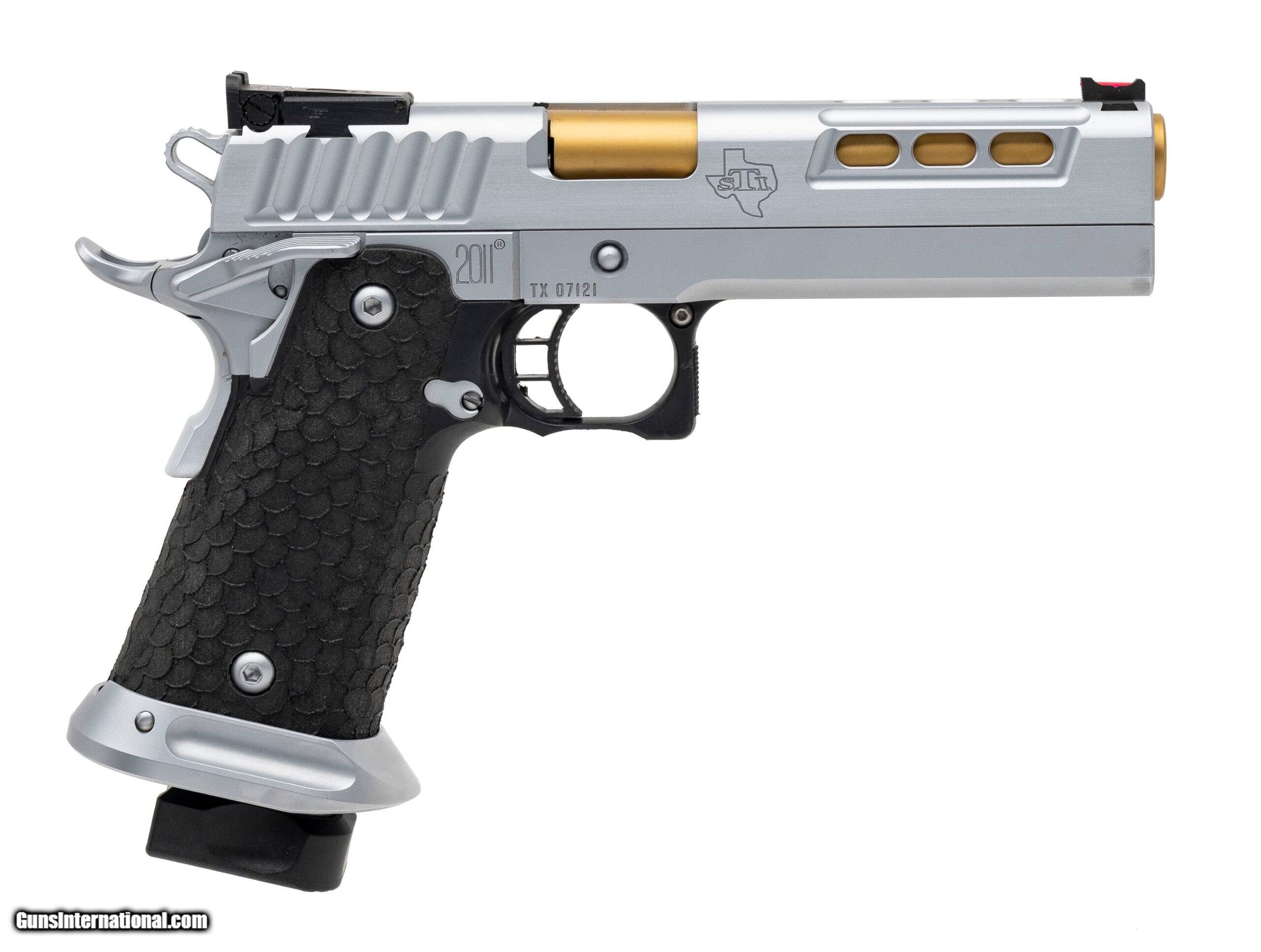 Description: "SN: TX07121. Modern production, 9mm with a 5"" titanium nitride bull barrel. Bore is excellent. Premium 1911 style competition pistol with a lightening cut slide, fiber-optic front sight, adjustable rear sight, ambidextrous manual thumb-safety, flared magwell, matte hard chrome finish, and textured polymer grips. Metal shows minor marks. Includes STI range bag, and original box. Overall condition is very good. SOLD |