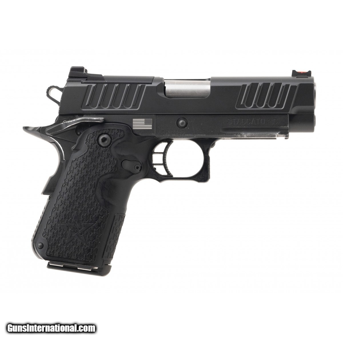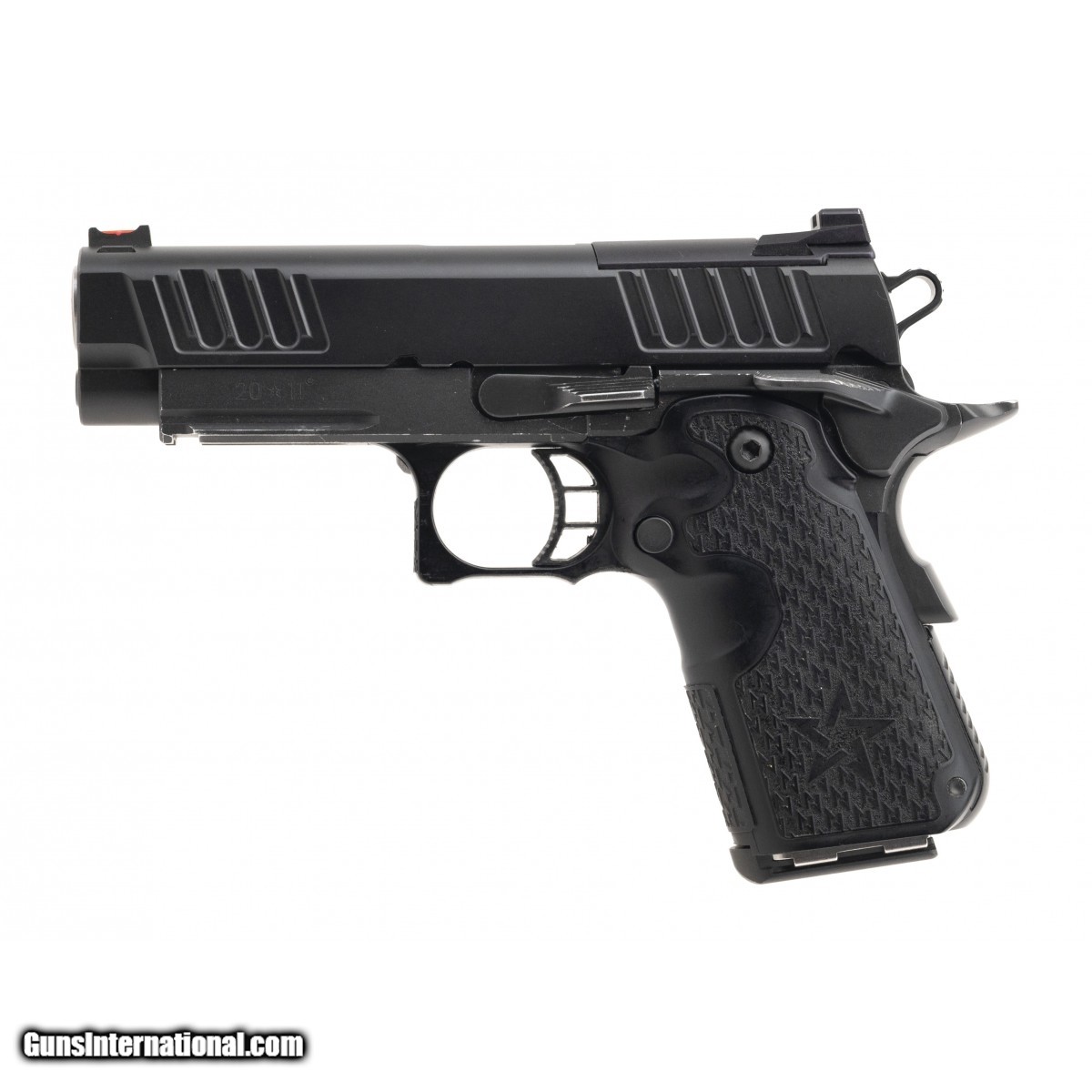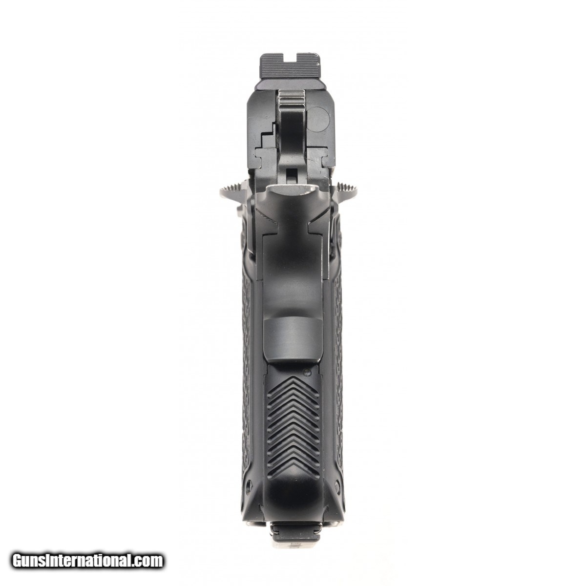 Description: " Alloy framed, single stacked, 1911 style compact 9MM pistol with fiber optic front sight, optic cut and picatinny rail. In very good condition. SOLD |