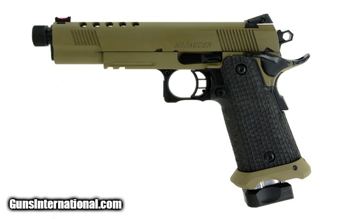 STI Marauder 5.0 9mm caliber pistol. 5” 2011 Double stacked model with threaded barrel and slide weight reduction cuts. FDE finish.