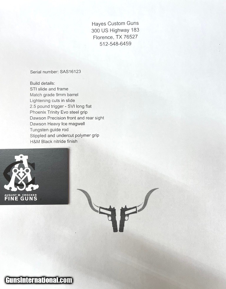 Description: Hayes Custom 2011 in 9mm. Build sheet leaves no doubt. Less than 100 rds down the pipe and has not seen comp use. Aaron & Ben Hayes Hayes Custom in Austin Texas typically have a year wait on their builds. Sourcing these parts=longer and a LOT more money. This gun feels incredible in the hands. Build sheet reads: Build details: