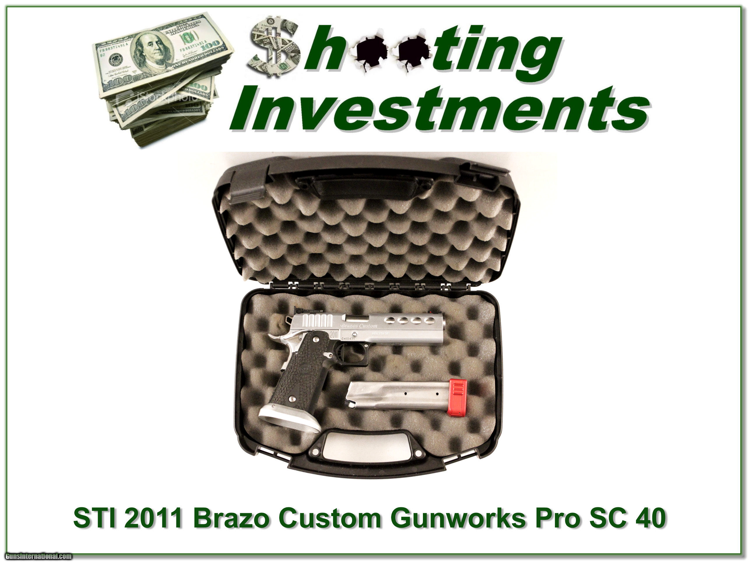 Description: This is a Brazo Custom STI 2011 in 40 S&W. It is the BCG Pro SC Limited and is in excellent used condition. It comes as shown with one magazine. I am selling this one on consignment and as such lay-a-way can’t be used. It does of course have the standard 3 day inspection. Shipping and insurance is $45. Please email me with any questions or larger pictures. (I now consign quality firearms only 10%! Let me know if you have any you would like to sell!) [16-0842] Payment: Payment is by Money Order, Cashiers Check or Personal Check. I can now also accept MasterCard and Visa with a 3% convenience fee. PayPal can be used for some items but never firearms. Please let us know if you would like to pay via PayPal. Shipping: The shipping charge will be listed in each description. It is $35 for most guns. Some heavy guns or those insured for over $2000 will be higher. Shipments to Alaska and Hawaii are higher because air shipment is required. Most firearms are shipped within 5 days of receipt of payment. We prefer shipping at the beginning of the week to avoid firearms in transit over weekends. We package all shipments carefully and insure them for the full purchase price, rounded up to the next $100. In the unlikely event that damage occurs, it is important that you save all packaging material for the claims process. Optics are shipped Priority Mail and most other non-firearm shipments are shipped First Class. Returns: Our return policy is simple. If for any reason you are not pleased with your purchase, you may return your item for a refund. The only exception is ammunition, it cannot be returned. It is important to us that you are happy. Guns cannot be fired or dissembled before returning them and must be returned in the same condition as received. Notification of a return must occur with-in 3 days of receipt at your dealer. Shipping, convenience and dealer fees are not refundable and are the responsibility of the buyer. Lay-a-way: If needed, we offer a 60 day lay-a-way option on most firearms. It is 1/3 now, 1/3 in 30 days and 1/3 in 60 days. Lay-a-way firearm sales are final. Consigning your firearms with Shooting Investments: We will help you get top dollar for your firearms. While most local guns shops charge 20% or more, our fee is only 10% with a minimum of $50. At your local gun shop it might take months to sell. Selling on-line provides instant access to thousands of interested buyers. You won’t find any other on-line dealer willing to sell your firearms for only 10% or listing every gun on 4 separate s. Selling through an House typically costs the seller 15% and the buyer an addition 15% (so 30%) and you have to wait several months to sell and longer to receive funds. If properly priced, we will sell your firearms in a week or two. Send us an email or give us a call and we’ll explain how easy it is for you to get top dollar. Trading: We collect guns and usually just trade for guns we want to add to our collections. We often sell guns for others wanting to purchase one of ours. We find this the most fair to both of us. Our Commission is only 10% and we hold the gun you want until yours sells. Please contact us if you want to sell one of yours to buy one of ours. Help for California Buyers: We are happy to ship to California. It is the buyer’s responsibility to make sure any item you buy is legal in your state. We are also happy to help with your purchase of a firearm from someone other than us. If you see a gun you would like to buy but the seller can’t or won’t ship to California we can help. You buy the gun and have it shipped to us. We’ll then ship it to your California dealer. The cost for this service is only $30 + shipping. Let me know if we can help! SOLD |