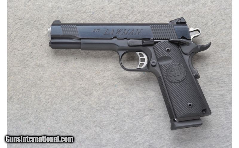 Description: This STI Model Lawman is a 1911 style right hand semi-auto pistol in .45 ACP Cal. It has a 5 inch barrel with a front and rear serrated black slide. A blade front and notch rear sight. The grip panels are a ribbed black composite. It has a grooved adjustable 3 hole trigger and a ringed serrated hammer. .45 ACP SOLD Caliber Info: .45 ACP Chambers: Semi-Auto 8 round magazine. Metal Condition: Excellent. Wood Condition: Grips are in excellent condition. Barrels: 5 inches with a front and rear serrated black slide. Triggers: Grooved. Adjustable. 3 hole. Sights: Blade front. Notch rear. Item Location: Richfield, WI |