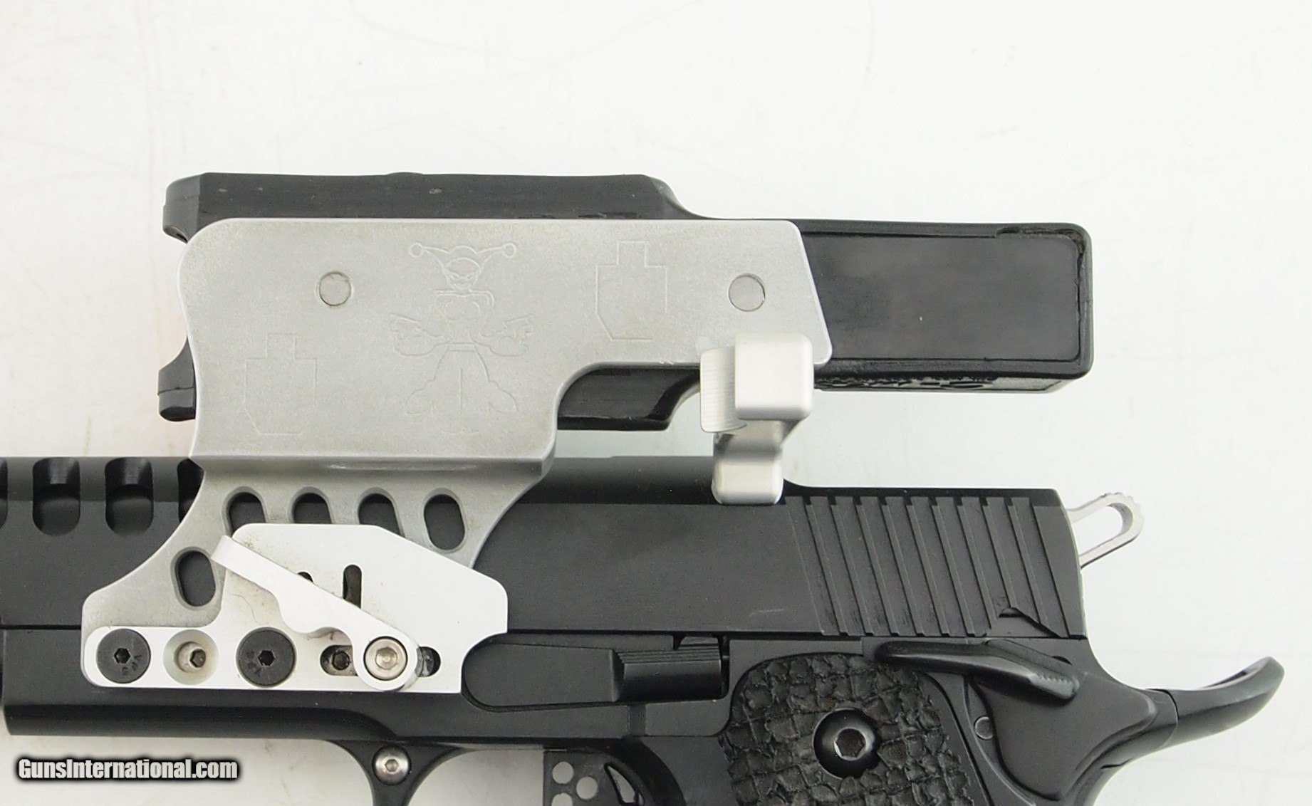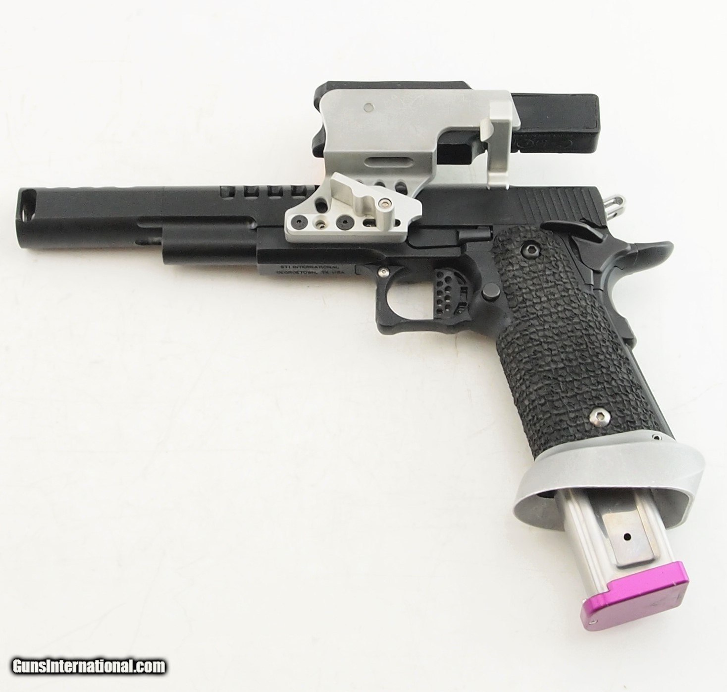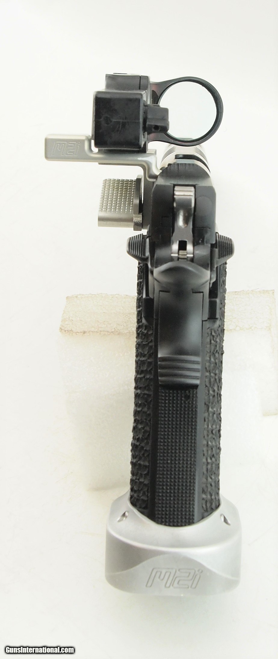 Description: STI - McLearn 2011 M2i Custom .38 Super, 5" Schuemann Hybricomp barrel with 3 Poppel holes, bright shiny bore, good rifling, M2i compensator, STI frame, M2i slide, 90 degree C-More red dot optic, ambidextrous thumb safety, gas pedal thumb rest, beavertail safety has been disengaged, M2i bevelled magwell, sleletonized trigger - hammer, one STI 140 mm magazine with Taran Tactical base plate, three STI 170 mm magazines with Taran Tactical base plates, aggressively textured grips, and 4 magazine pouch. We do not know shot count, but it appears to be low. Add 3% for Credit Card Shipping $35.00 SOLD |