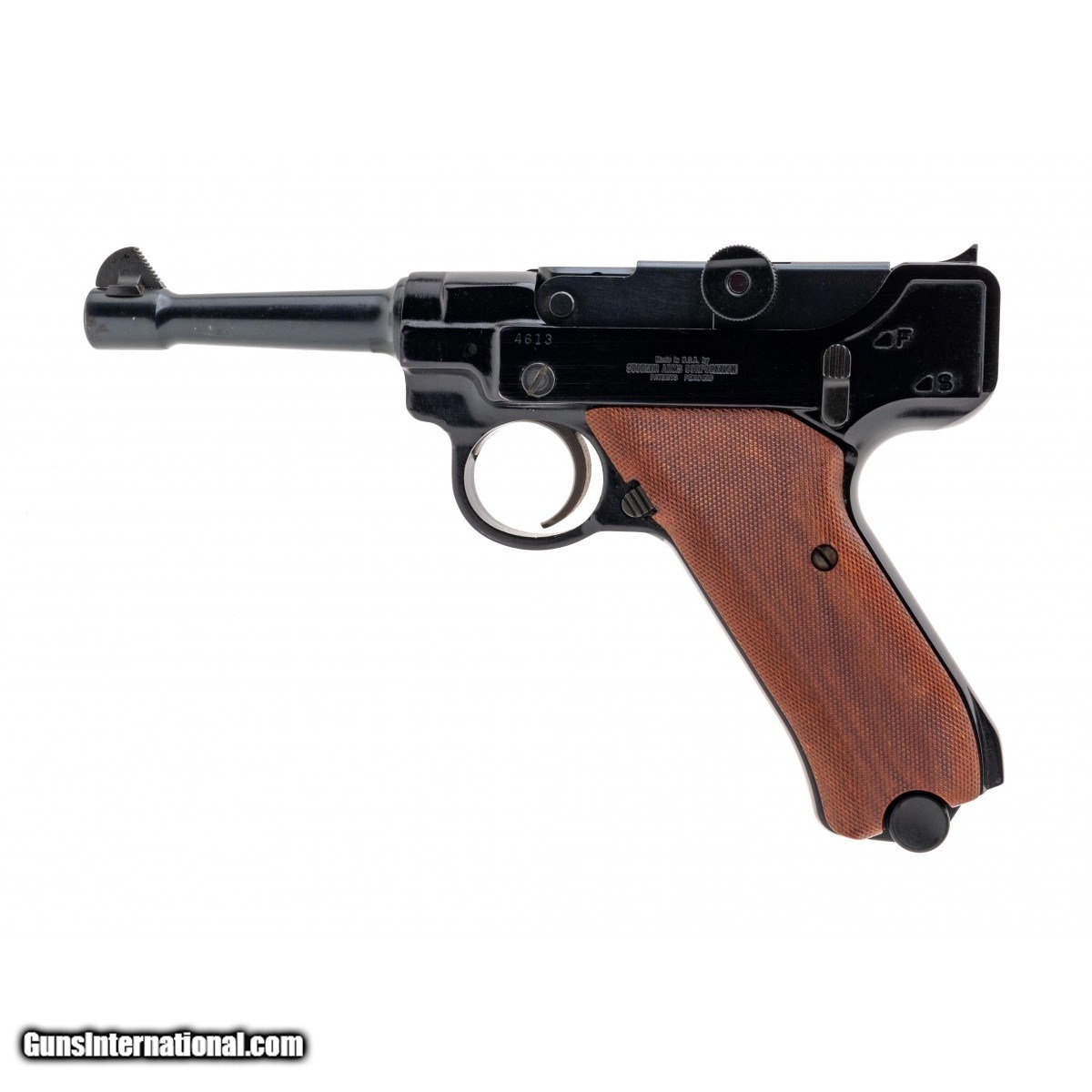 SN: 4613. Circa 1969-1985. .22LR with a 4.5"" barrel, bore is excellent. Rimfire handgun modeled after the Luger handgun, good blue finish and checkered walnut grips. Overall very good condition.