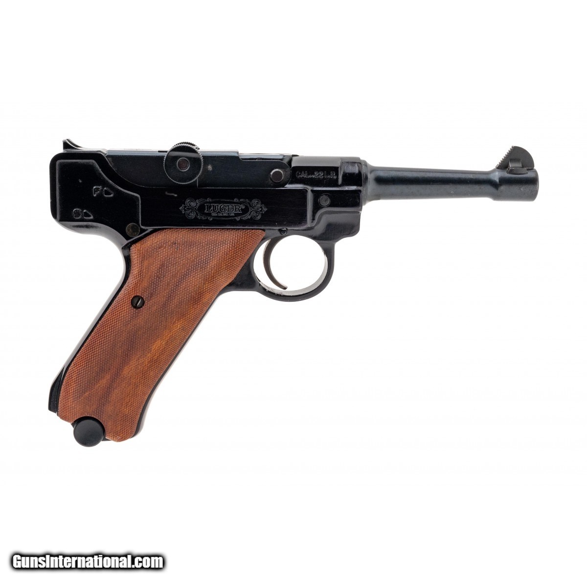 Description: " SN: 4613. Circa 1969-1985. .22LR with a 4.5"" barrel, bore is excellent. Rimfire handgun modeled after the Luger handgun, good blue finish and checkered walnut grips. Overall very good condition. SOLD |