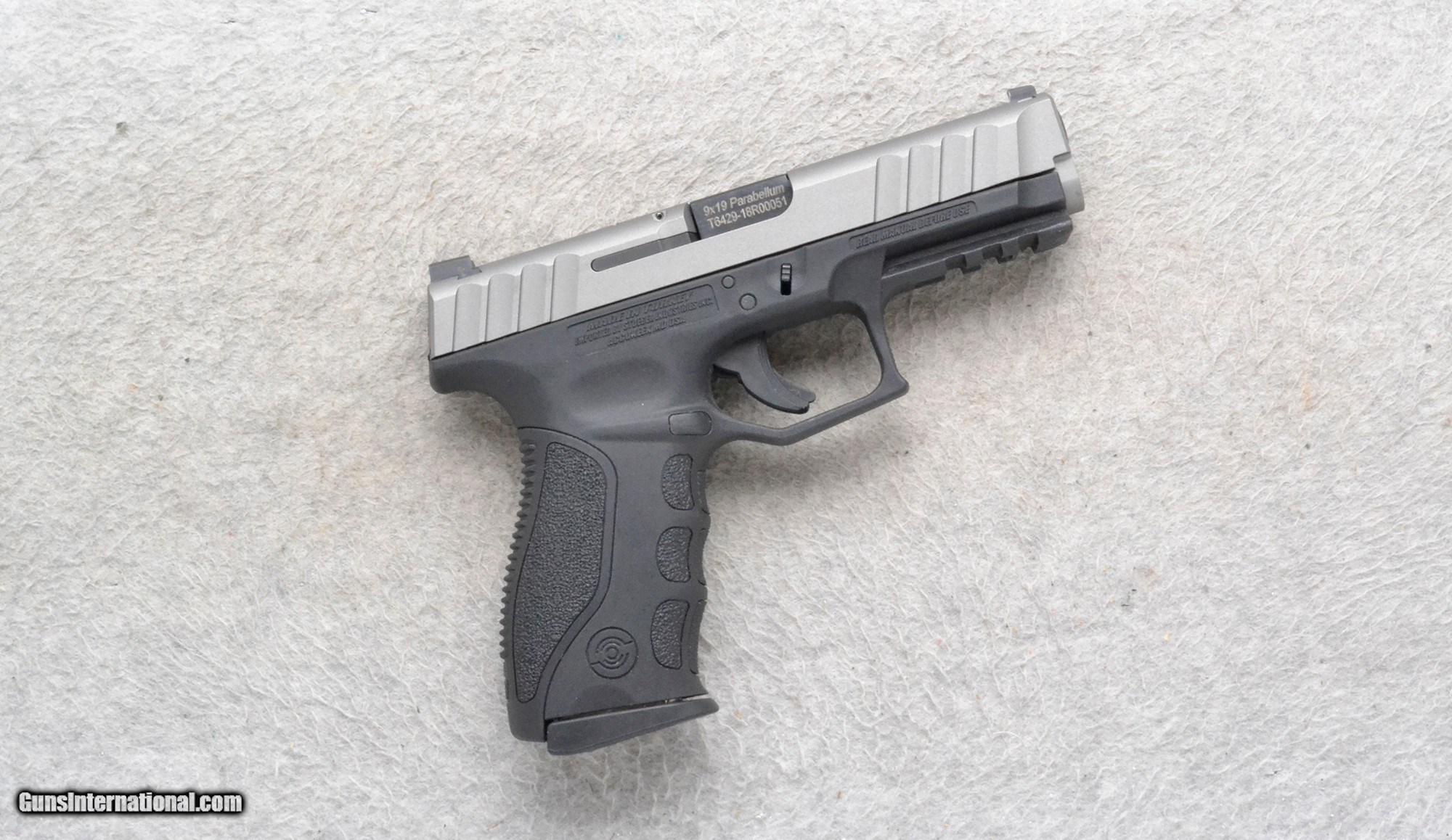 Description: This Stoeger Model STR is a right hand semi-auto pistol in 9mm Cal. It has a 4 inch barrel with a front and rear serrated slide. A blade front sight and notch rear sight, both with white sight dots. The grip is a textured black polymer with molded finger grooves. It has a lower accessory rail. 9mm Parabellum SOLD Chambers: 15 round magazine. Metal Condition: Excellent. Bore Condition: Excellent. Barrels: 4 inch barrel with a front and rear serrated slide. Weight: 26 oz. Sights: Blade front. Notch rear. White sight dots. Item Location: Richfield, WI |