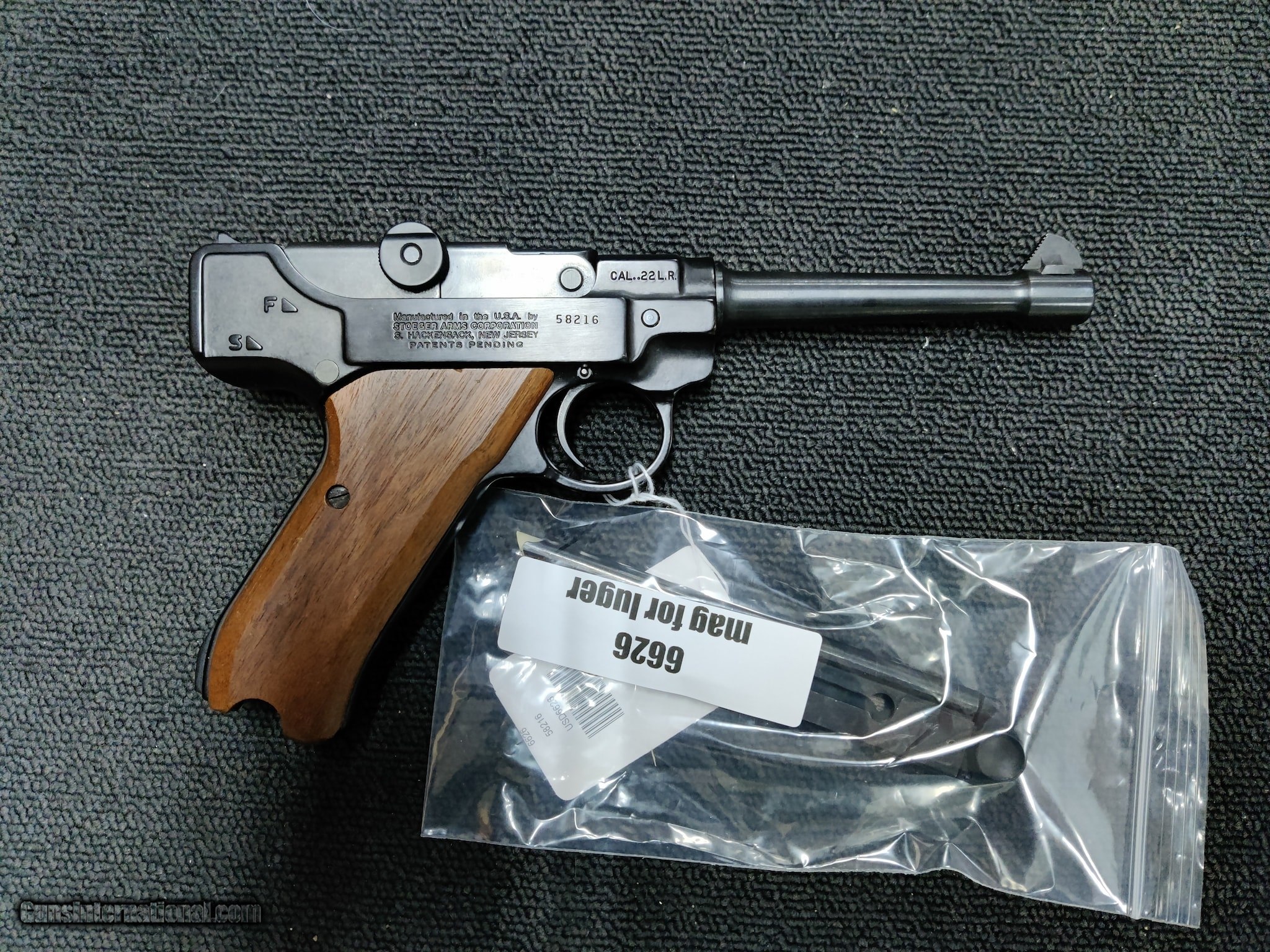 Description: Guns Listing ID: 380669 GREAT Condition. Doesn't look to have been fired. Stoeger Luger Navy Style 22LR 1 Magazine Never Fired 5.5in Barrel SOLD Manufacturer: STOEGER Model: LUGER 22 w/1 Mag Caliber Info: 22 LR Condition: Used - Non-Certified Barrels: 5.5 BARREL Finish: BLUED |
