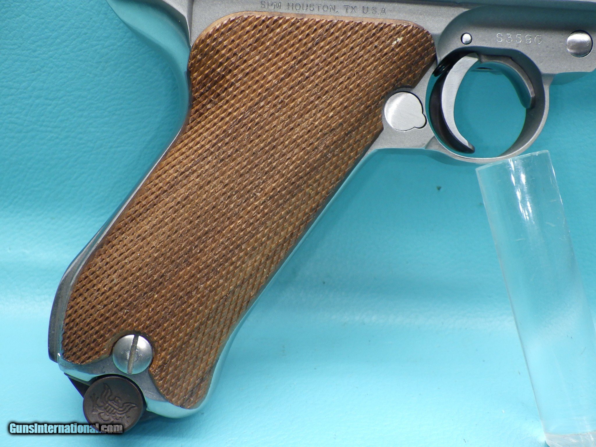 Description: ***SOLD***Make: Stoeger Model: Luger American Eagle Stainless Finish: Polished stainless steel Caliber: 9x19mm Action: Semi automatic Barrel length: 4 inch Bore: Shiny with sharp rifling Grips: Checkered walnut Sights: Standard fixed MFG Date: Features: Classic P-08 styling, American eagle engraving on the barrel, stainless steel construction, curved front grip strap, and one 7 round magazine with eagles on both sides. Extras: Serial number matching box, owners manual, and factory catalog Condition: Excellent shape! Shipping Cost: $40.00 Tech: JT12624.1999 The pistol functions great with a smooth action and strong ejection. Please refer to the photos for the overall condition. FFL is required. No handgun sales in MA.***SOLD*** SOLD Handgun Caliber: 9x19mm Parabellum (9mm Luger, 9x19mm NATO) Manufacturer: Stoeger Model: Luger American Eagle Serial Number: S3580 Barrel Length: 4 |