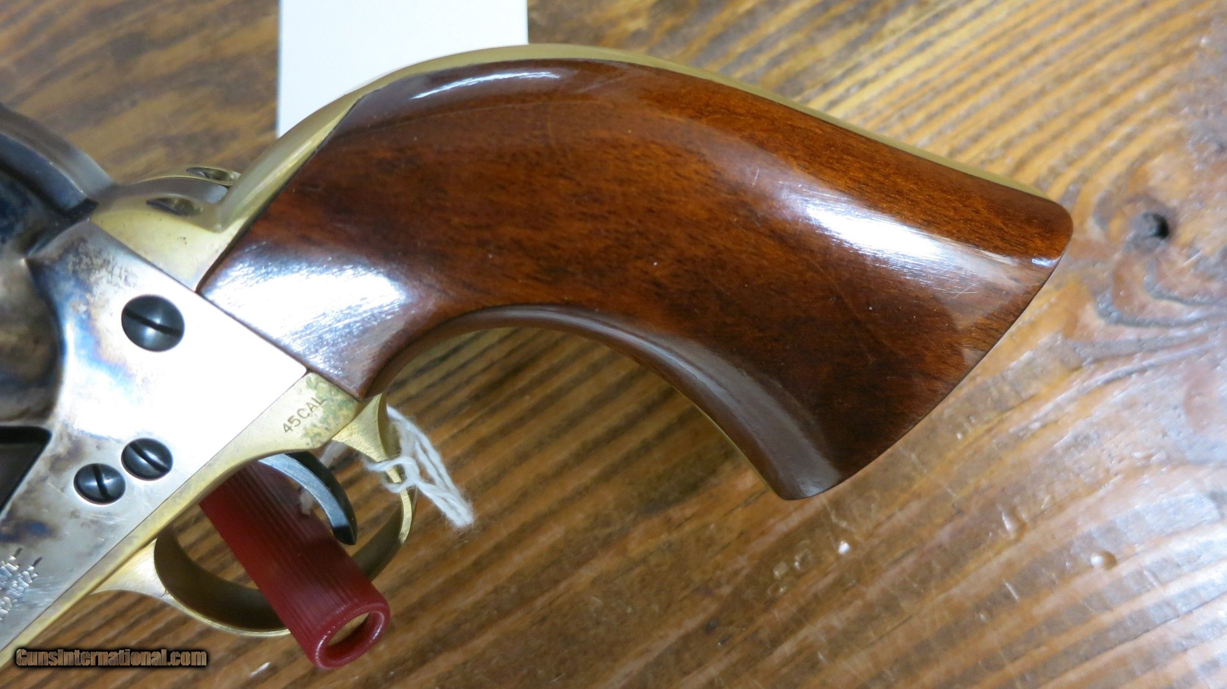 Description: STOGER BY UBERTI MODEL 1871 IN .45 LC WITH A 4.75" BARREL. COMES WITH AN OLDER LAWRENCE HOLSTER. REVOLVER IS IN VERY GOOD CONDITION. HOLSTER HAS GOOD HONEST WEAR BUY STILL IN VERY GOOD CONDITION. JUST BROOK IN. REVOLVER FITS PERFECT. REVOLVER IS $550.00. WITH HOLSTER $625.00. CALL OR E-MAIL WITH QUESTIONS: SOLD |