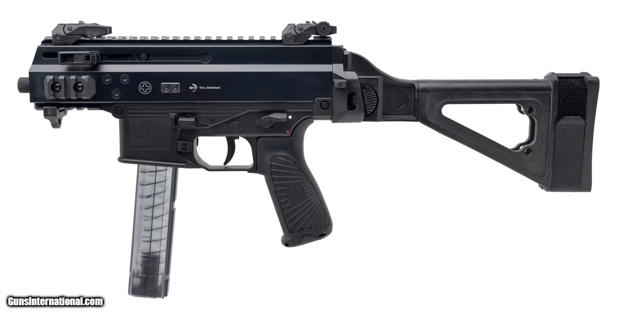 Description: "SN: US20-33574. Modern production, 9mm with a 4.3"" threaded barrel. Bore is bright with strong rifling. Swiss made tactical pistol with a Wilson Combat grip, flip-up sights, accessory rails, ambidextrous controls, and an SB Tactical side-folding brace. Excellent condition overall. Comes with case, sling, and cleaning tools. Price: $2,495.00 Contact Seller |