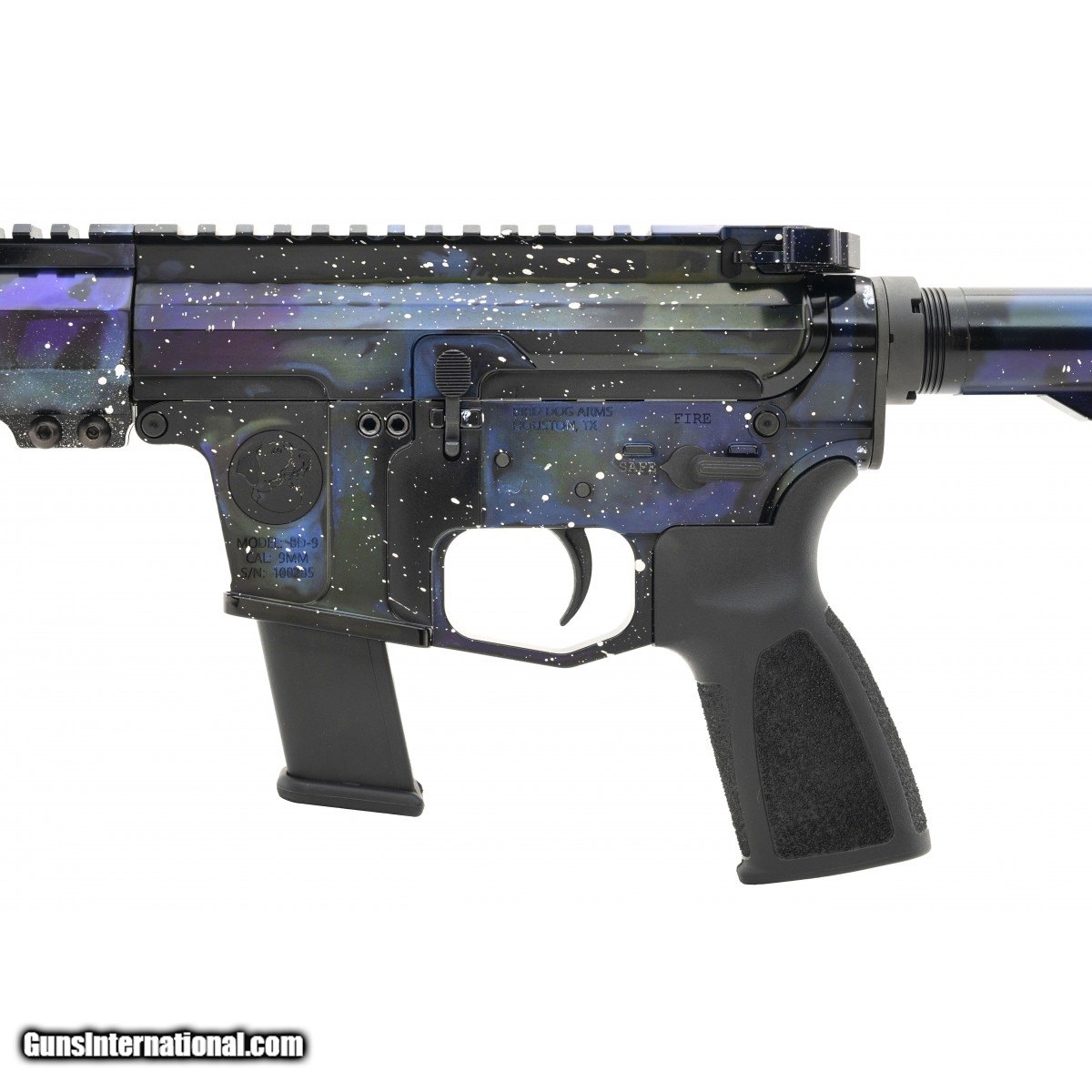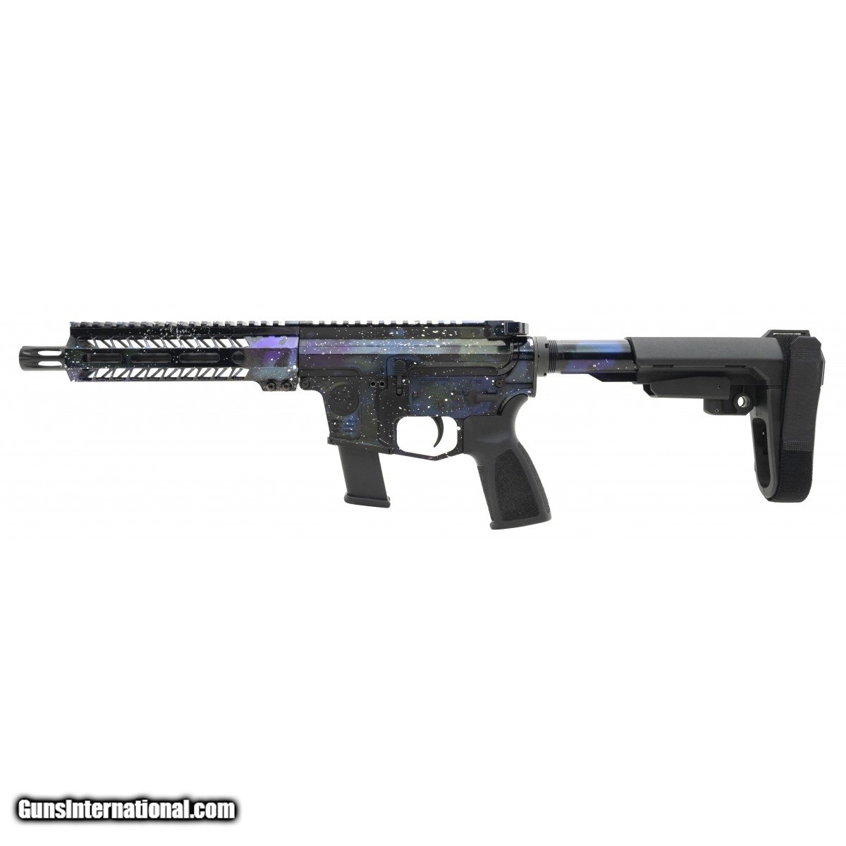 Description: " Houston-made tactical pistol with 8"" barrel, 7.5"" free-floating M-Lok rail and SB tactical brace. Accepts Glock Pattern magazines. In ""Galaxy"" polished anodized finish. NEW. SOLD |