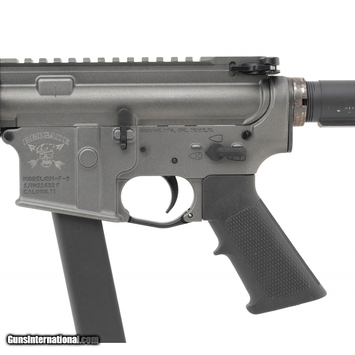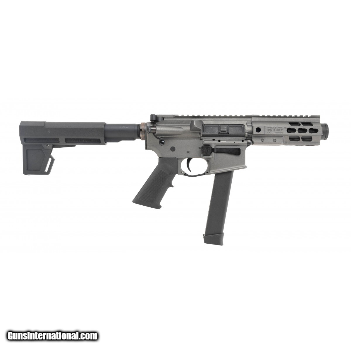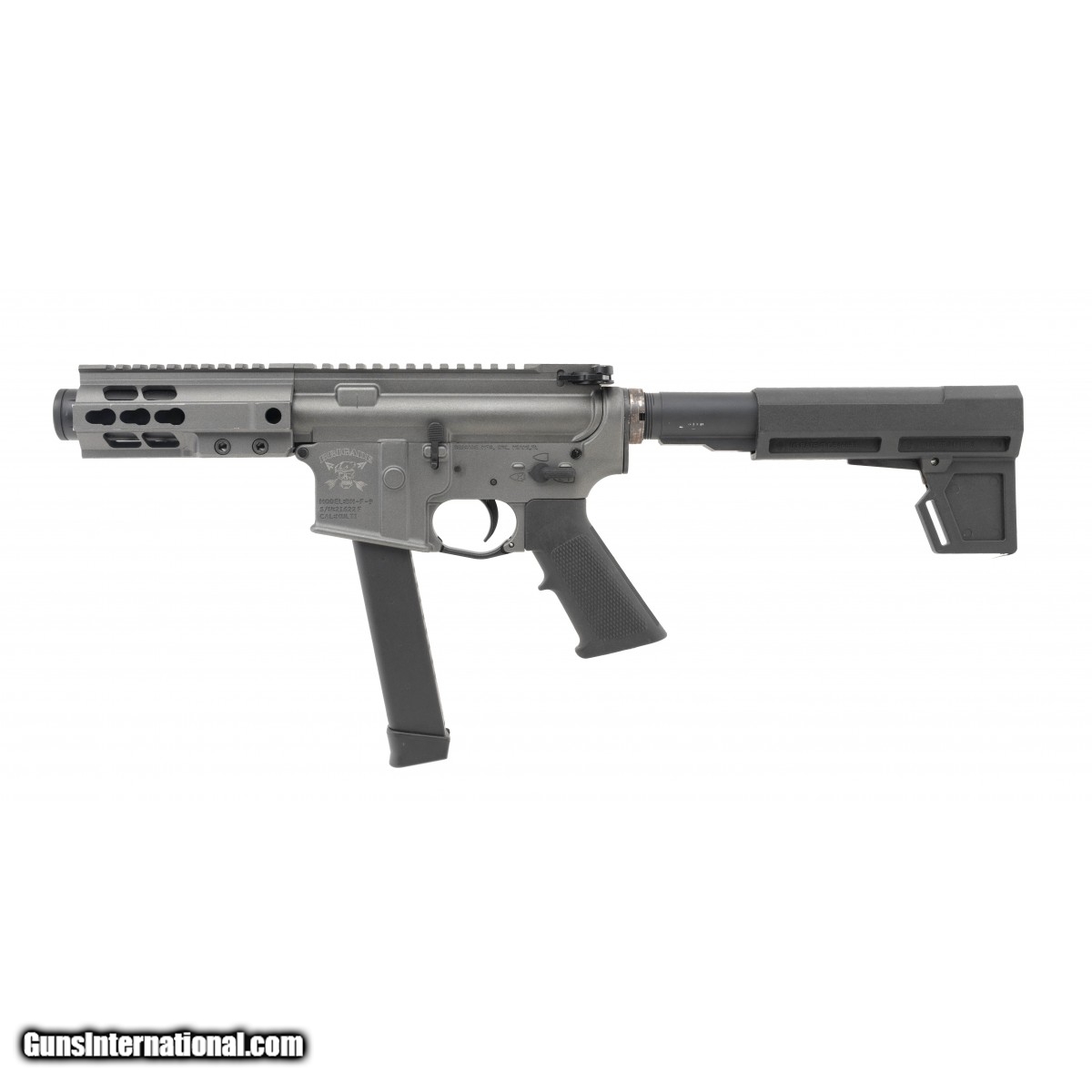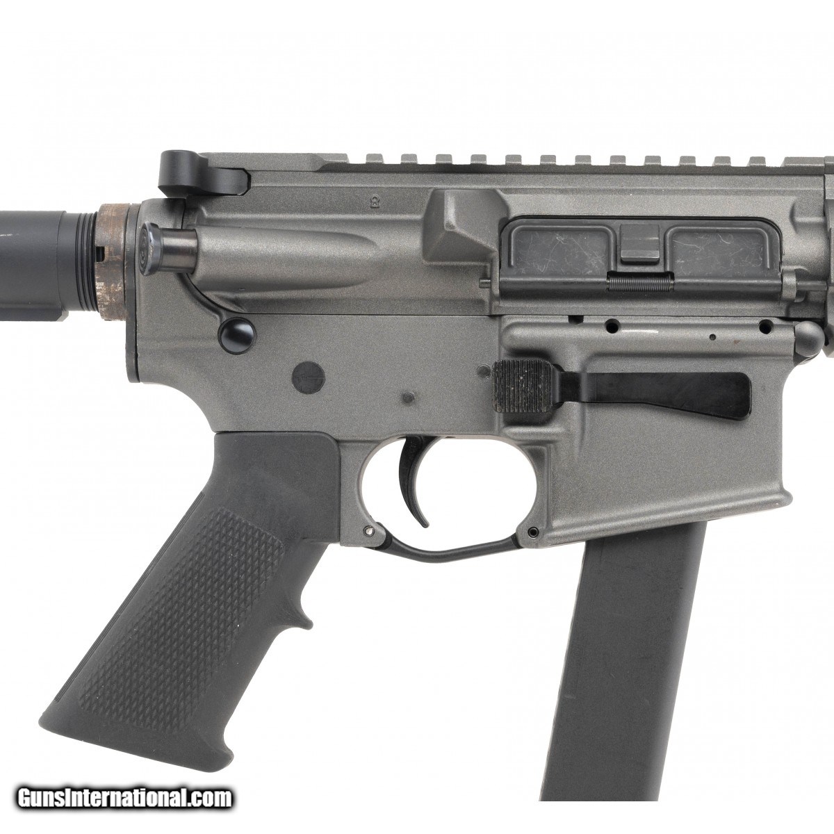 AR-9 with 1:10 twist, 5.5""barrel. Nitride finish, keyMod rail, A2 grip, ""pistol fin"" brace, uses Glock magazines. Comes with magazine. Overall condition is very good plus.
