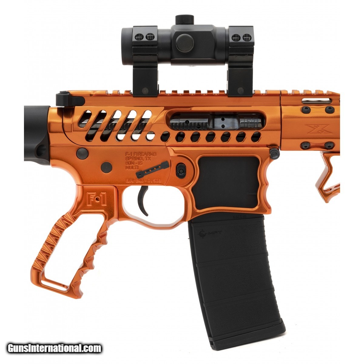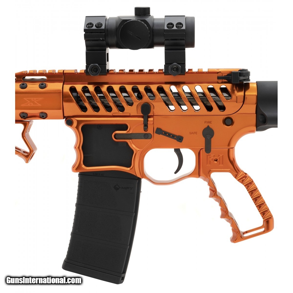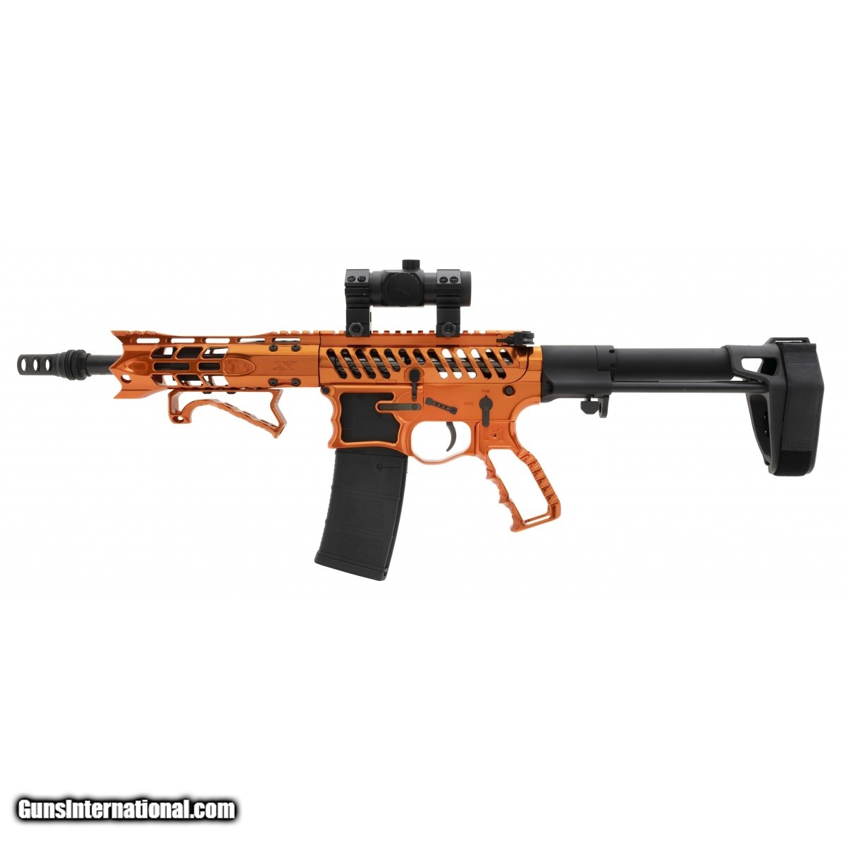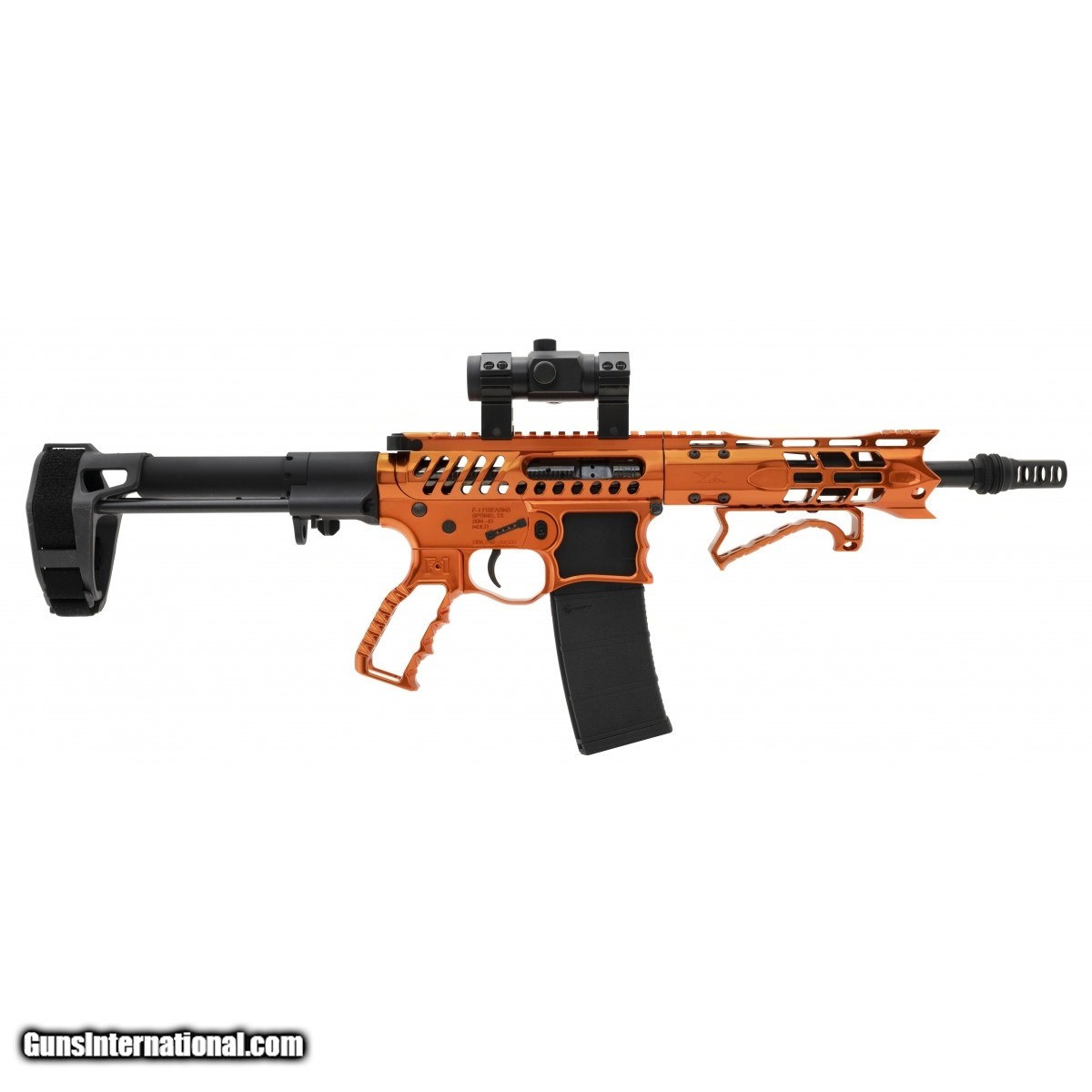 SN: 240-01508. Skeletonized tactical pistol with 9.5"" barrel and orange aluminum matching receiver. Marching orange angled foregrip. AAC MK13-SD muzzle brake, Maxim telescopic brace. Overall excellent. Comes with red dot optic.