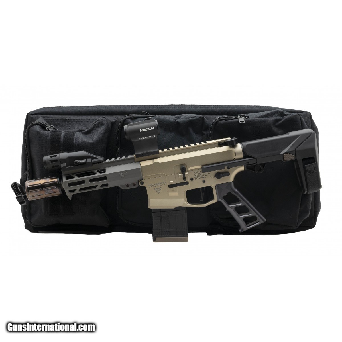 Description: " Tactical pistol with 7.5"" barrel and clear anodized billet receiver. Has Fail zero bolt, CMC flat trigger, light weight grip, SB Tactical HBPDW brace, Holosun HE403B green optic, Inforce WML and titanium muzzle device and RT blast Diverter. Comes with range bag. NEW. SOLD |