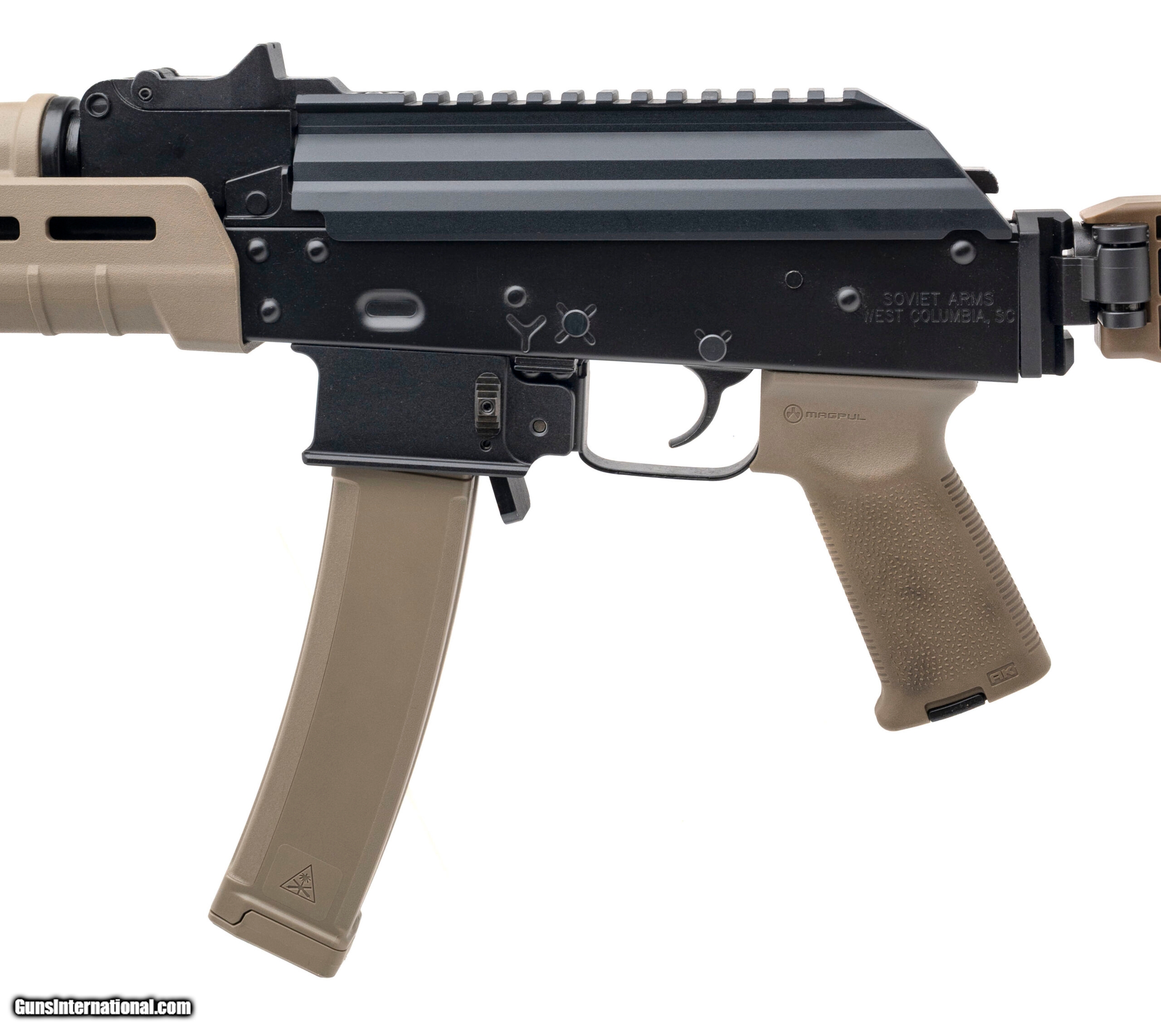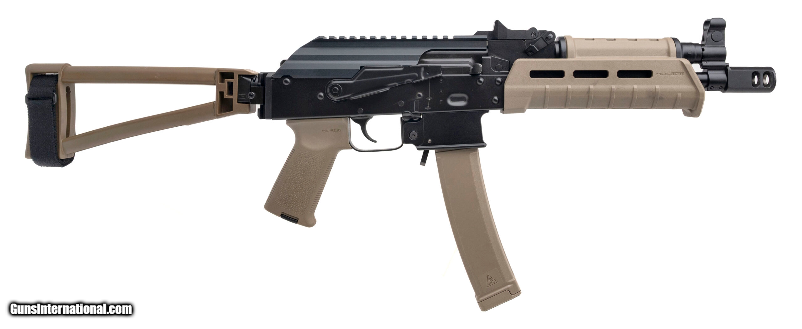 Description: "SN: V002951. Modern production, 9m with a 10.5"" barrel w/2-port muzzle brake. Bore is bright with strong rifling. Semi-auto tactical AK pistol with FDE Magpul furniture, picatinny rail dust cover, and an FDE SB Tactical side-folding brace. Near excellent condition overall. Price: $850.00 Contact Seller |