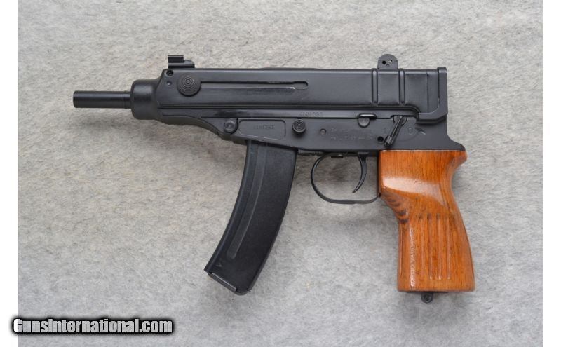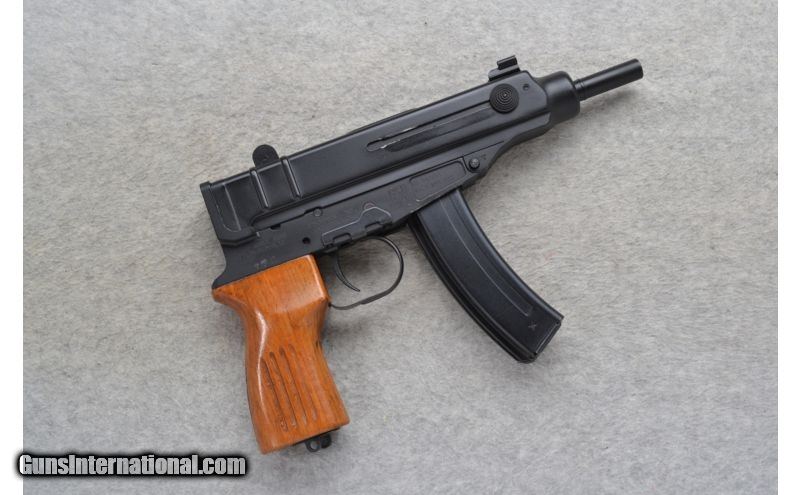 Description: This CZ Model VZ 61 Skorpion is a semi-auto pistol in 7.65mm Cal. (.32 ACP). It has a 4.5 inch matte black barrel. A front post sight and flip up notch rear sight. The grip is a vertical grooved walnut. It is a hammer fired straight blowback operated that fires from the closed bolt position. It is extended stock capable. It is still in use as a sidearm by armed forces in several countries. An interesting firearm it is in very good condition. SOLD Caliber Info: 7.65mm (.32 ACP) Chambers: Semi-Auto 20+1. Metal Condition: Very Good. Wood Condition: Very good. Light handling marks. Bore Condition: Very good. Barrels: 4.5 inch matte black. Stock: Vertical grooved walnut. Weight: 45 oz. Sights: Post front with protective sides. Two position flip up notch rear. Item Location: Richfield, WI |