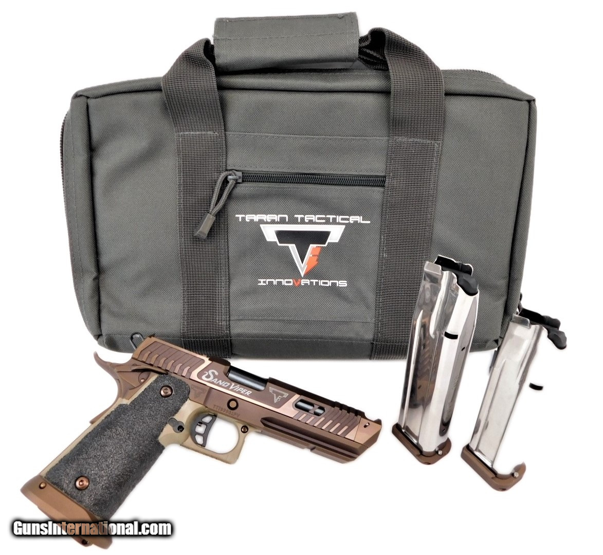 Description: Manufacturer: Taran Tactical Innovations - Simi Valley, CA Model: The Sand Viper - JW4 PV SKU: TTI-SV-SPSC Caliber: 9mm Luger Capacity: (1) 17 Round, (1) 22 Round and (1) 28 Round Barrel: 5", Large Single Port Compensator with DLC Coated Match Grade Barrel Fire Control Group: Extreme Engineering (Lite Speed Hammer, Ultra Low Mass Sear, Match Disconnector and Titanium Hammer Strut) Trigger Pull: 1.75-2.25 LBS Sights: None, Ultra Low Precision Optic Cut for Trijicon RMR/SRO Slide: High Polished Coyote Bronze DLC Coating Mainspring Housing: Steel, Checkered and Coyote Bronze DLC Coated Frame: FDE, Single Undercut with TTI Grip Job and Full Wrap Stipple - Right Handed Safety: Ambidextrous, Blended Slide Release: Extended Magazine Release: Extended Checkered Aftec Extractor Oversized Magwell Accessory Rail Cut Weight (without magazine): 35.2 ozs This firearm has just been received from Taran Tactical after being on order for over 5 months. This pistol is brand new and ships with everything shown in the pictures! It has only been test fired by Taran Tactical after the build was completed. The Sand Viper was designed to be the ultimate 2gun/3gun pistol. This firearm runs flawlessly with any factory or handloaded ammunition. With its extremely flat shooting compensator and low bore axis optic cut, point of aim will be nearly dead on at every distance from 5 yards to 50! This gun is already the sickest serpent on the planet holding the overall win at the USPSA 2gun nationals. Unlike many other 2011s, the fit and finish is like nothing you've ever held. These guns are tailor designed to fit and feel exactly like the guns Taran has used building his legacy. The memory groove is blended seamlessly to activate immediately. For any shooter this is the most astonishing handgun you'll ever hold. Be careful of its hidden fangs! SOLD |