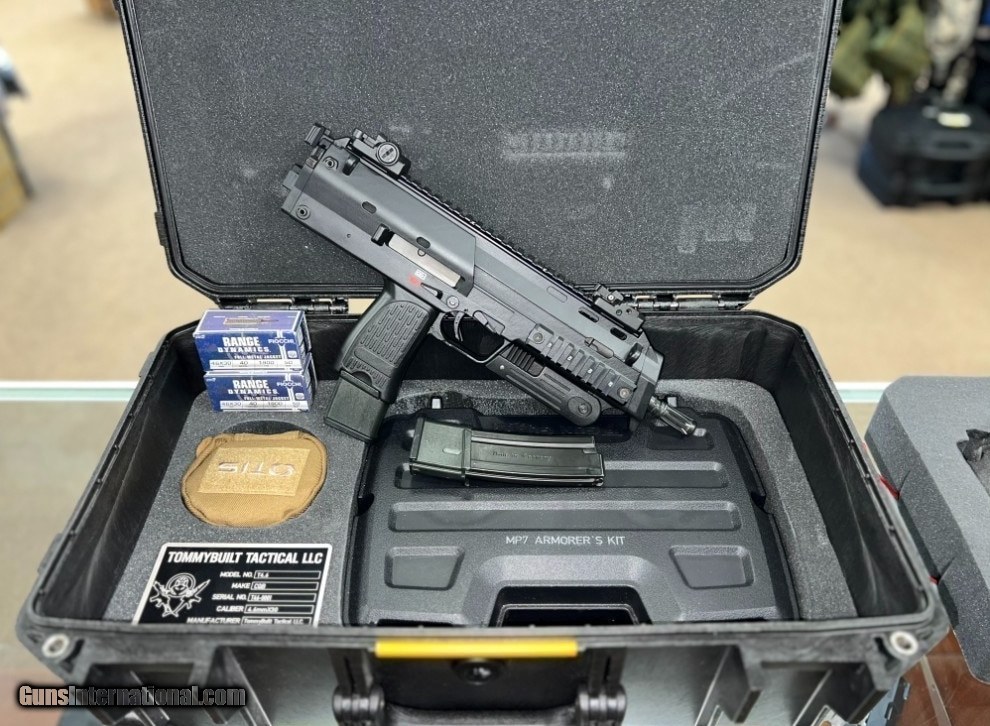 Description: Guns Listing ID: 900693 THIS IS THE FIRST TMP7 MADE BY TOMMY FROM TOMMY BUILT TACTICAL IN LAKELAND, FL. THE SERIAL IS #0001 HAS A CETIFICATE OF METAL PLATE OF AUTHENTICITY. THIS IS PRETTY MUCH ALL ORIGINAL HK. IT HAS THE NON 90 DEGREE FOREGRIP. THIS IS A PISTOL. CALIBER 4.6x30 TWO EXTENDED MAGS OTIS CLEANING KIT MADE SPECIFICALLY FOR THIS FIREARM AND MP7 ARMORER‚‚S KI SOLD Manufacturer: TOMMY BUILT TACTICAL Model: T4.6 Caliber Info: 4.6X30MM HK Condition: Used - Non-Certified Barrels: 7 BARREL Finish: BLACK |