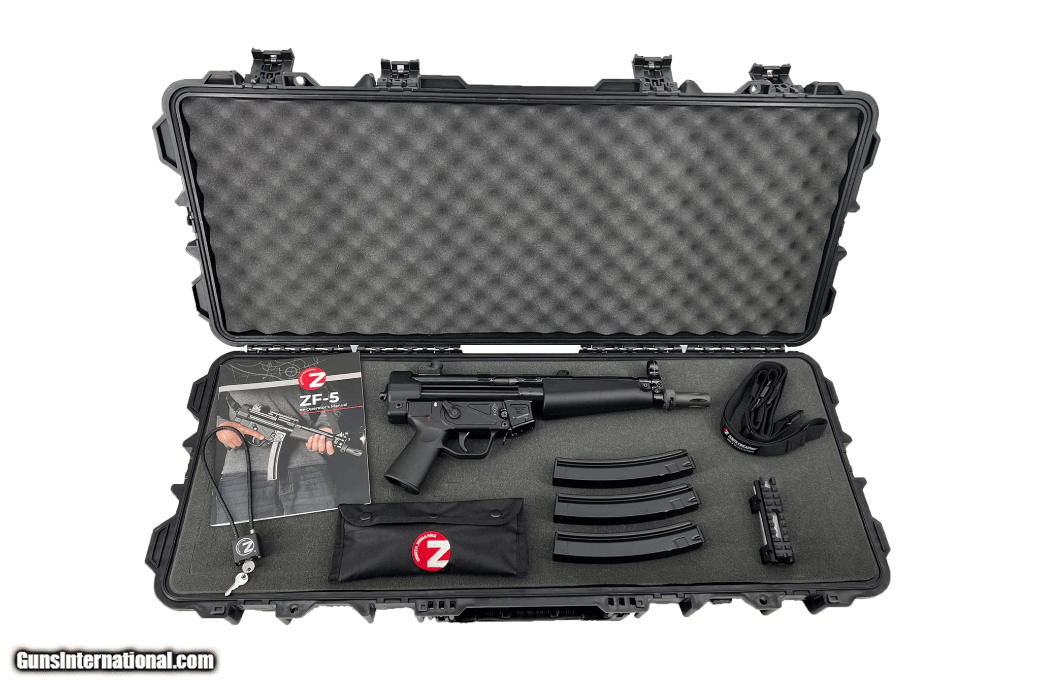 Description: Guns Listing ID: 209757 The ZF-5 is an American-made MP5-style close-quarters pistol. The ZF-5 features all of the popular features of the venerable MP5 system such as the roller-delayed blowback action and side charging handle that allows users to perform the famous \"HK Slap\" technique. Additional iconic features include the rotary drum rear sight and 3-prong removable flash hider to complete the MP5 clone look. The premium package includes three 30-round magazines along with a detachable optics rail, 2-point sling, and a cleaning kit that includes two additional replacement takedown pins. The barrel is threaded and is compatible with most aftermarket suppressors and muzzle devices. Manufacturer: ZENITH Model: ZF-5 (PREMIUM PACKAGE) [BLK] Caliber Info: 9MM LUGER (9X19 PARA) Condition: new Barrels: 8.9" BARREL Action: BLOWBACK Finish: BLACK Weight: 5.5 lbs. Price: $1,704.99 Contact Seller |
