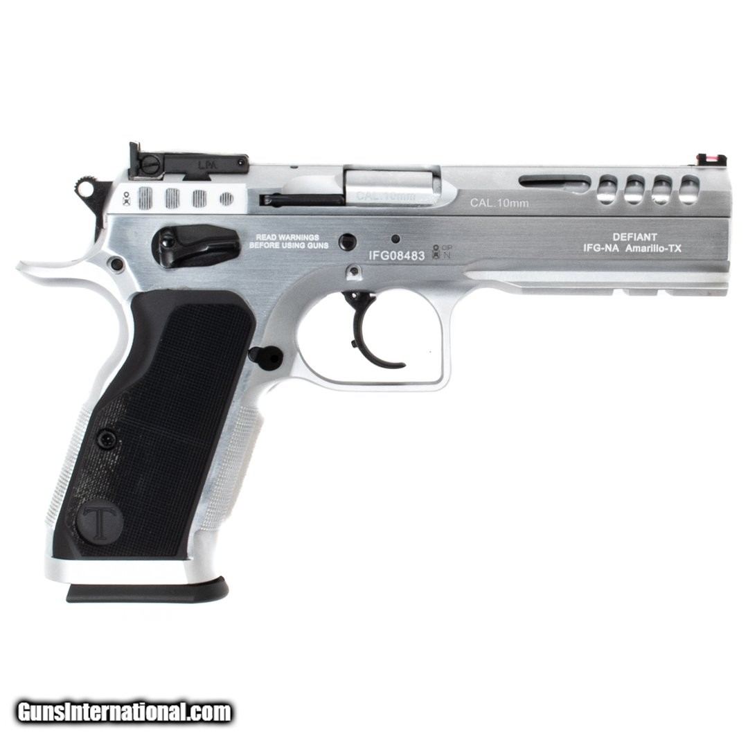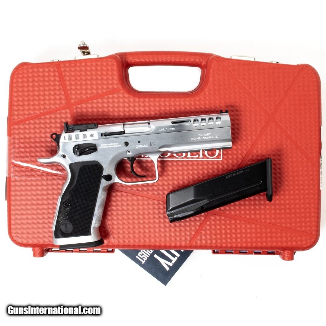 Description: Guns Listing ID: 574504 This Tanfoglio pistol comes with two 14-round magazines, the original case, owner‚s manual, a flared magwell, an ambidextrous safety, an adjustable rear sight, fiber optic front sight and a ported slide. Get the best bang for your buck when you get a Certified Used Firearm . When you see the Certified Used stamp on any of our firearms, you can be confident that you‚re getting exactly what you want – a gun only in very good to excellent condition and held to the highest quality standard. All Certified Used Guns come with a ‚no questions asked‚ return policy . SOLD Manufacturer: TANFOGLIO Model: DEFIANT STOCK MASTER Caliber Info: 10MM Condition: Used - Certified Barrels: 4.90" BARREL Action: SEMI AUTOMATIC Finish: stainless Weight: 2.6 |