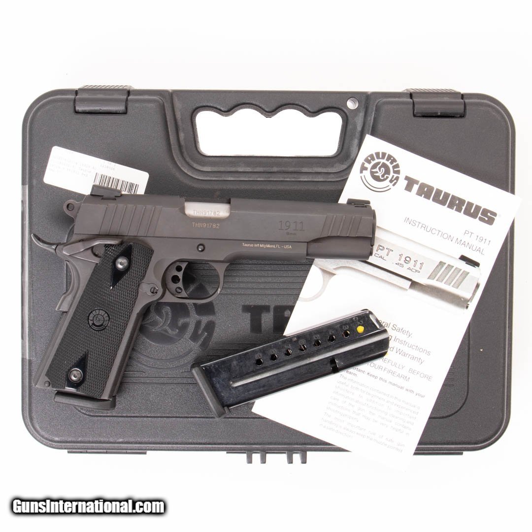 Description: Guns Listing ID: 500908 This Taurus comes with two 9-round magazines, the original case, owner‚‚s manual, an ambidextrous thumb safety and a sight adjustment tool. Get the best bang for your buck when you get a Certified Used Firearm . When you see the Certified Used stamp on any of our firearms, you can be confident that you’re getting exactly what you want – a gun only in very good to excellent condition and held to the highest quality standard. All Certified Used Guns come with a ‘no questions asked’ return policy . PLUS, ALL CERTIFIED USED GUNS SHIP FREE SOLD Manufacturer: TAURUS Model: 1911 Caliber Info: 9MM LUGER (9x19 PARA) Condition: Used - Certified Barrels: 5.00 Action: SEMI AUTOMATIC Finish: black & stainless Weight: 2.6 |