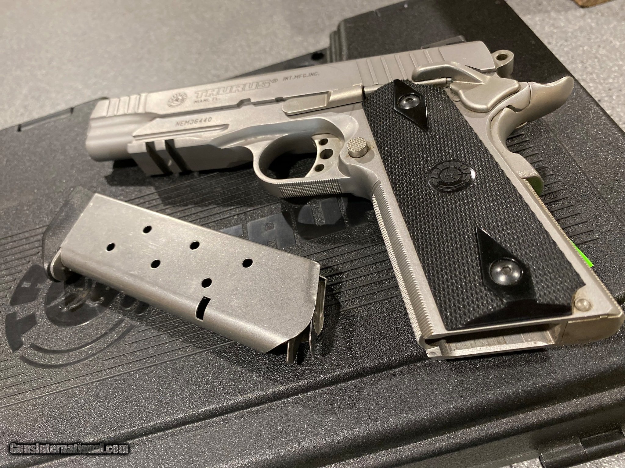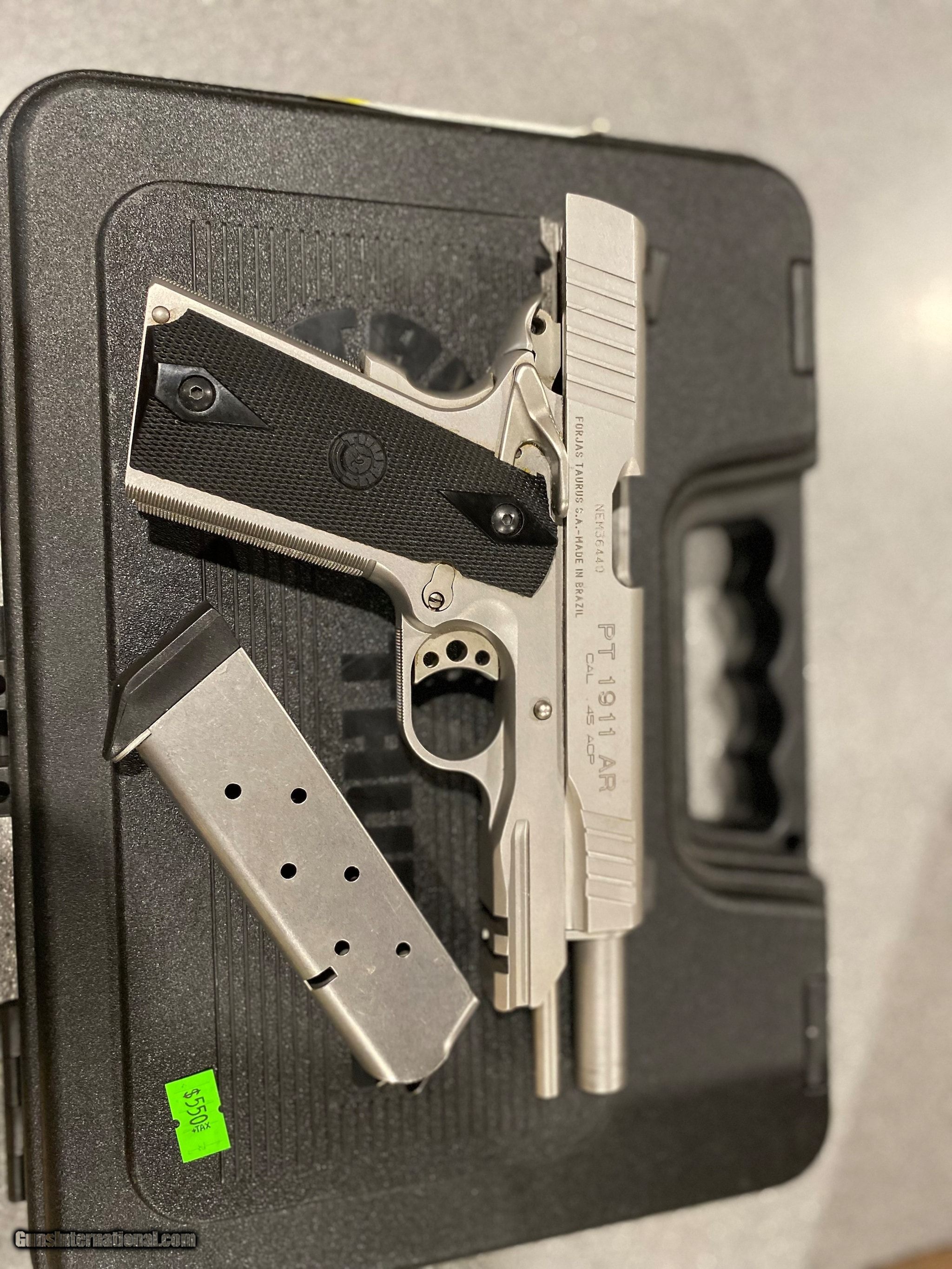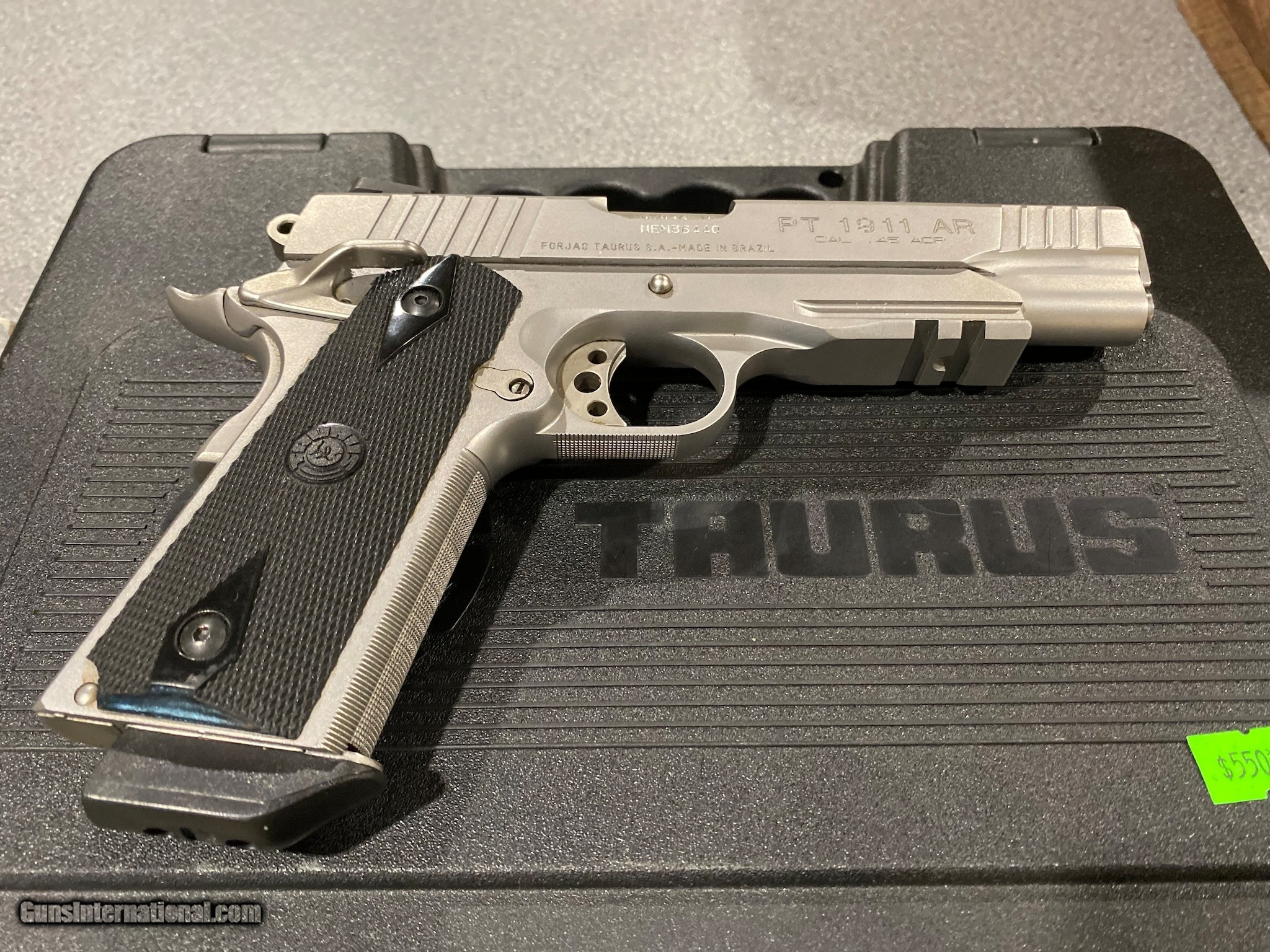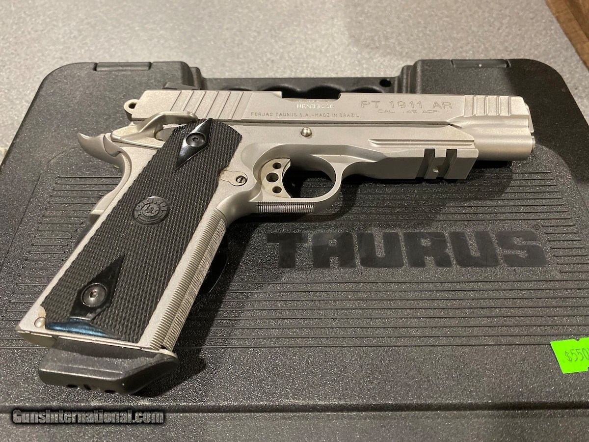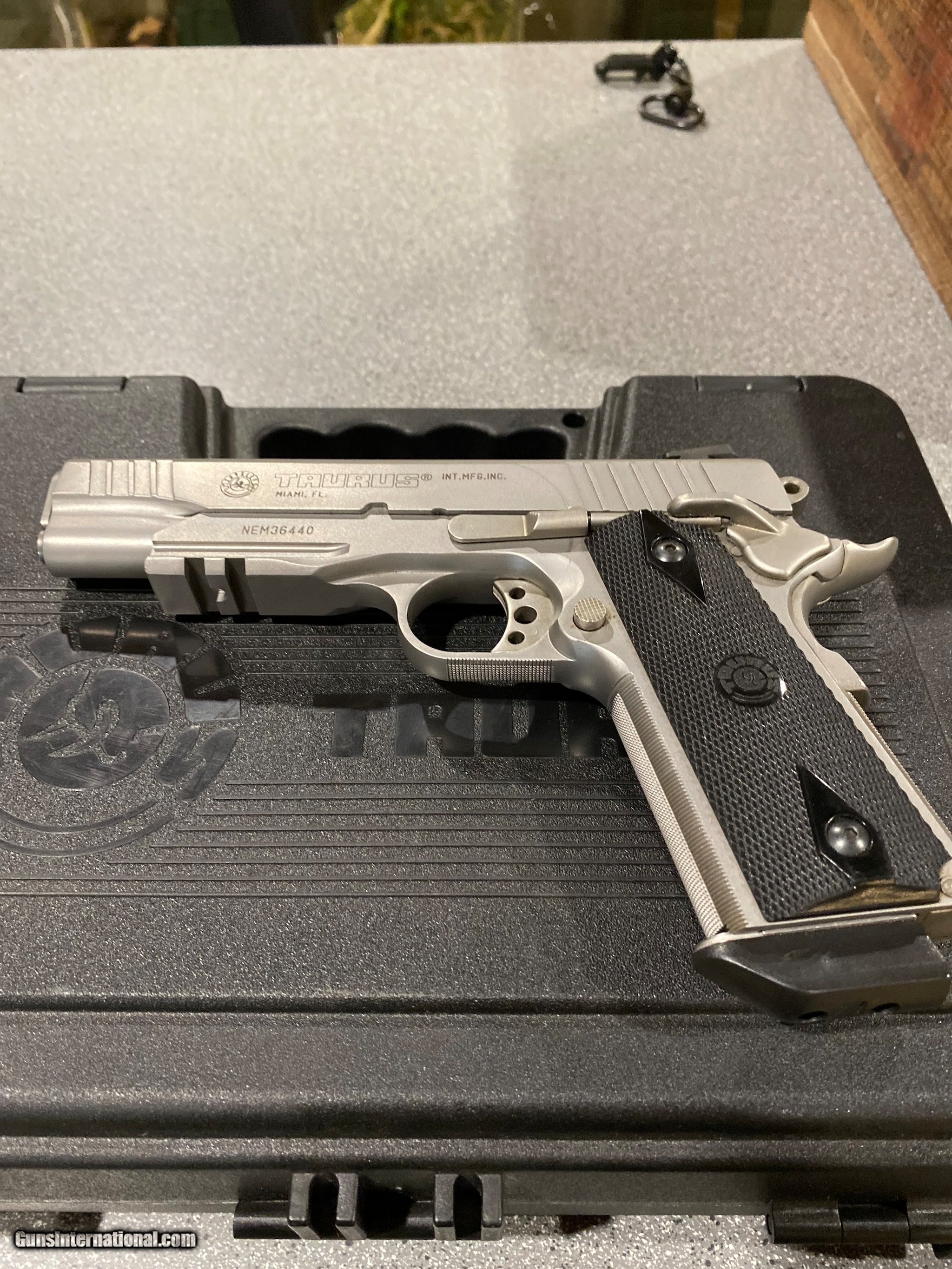 Description: Guns Listing ID: 547867 FRAME SIZE Full BARREL LENGTH 5.00 In. OVERALL LENGTH 8.50 In. OVERALL HEIGHT 5.50 In. OVERALL WIDTH 1.50 In. OVERALL WEIGHT 42.00 Oz. (Unloaded) TWIST RATE 1:16 - in RH twist GROOVES 6 SOLD Manufacturer: TAURUS Model: 1911 Caliber Info: .45 ACP Condition: Used - Non-Certified Barrels: 5 barrel Finish: STAINLESS |