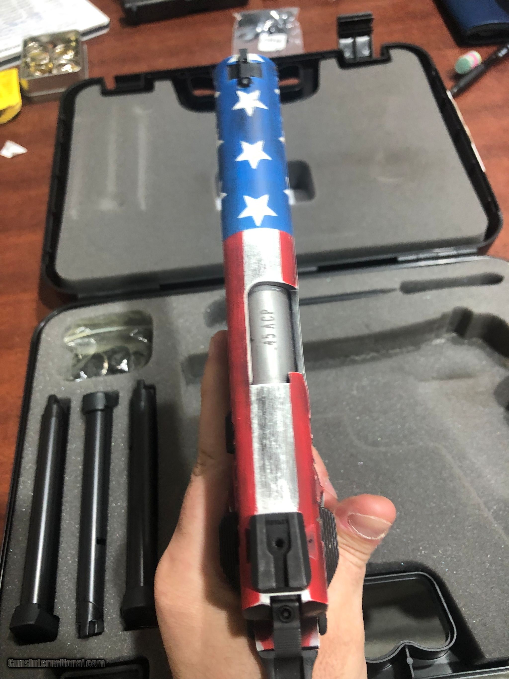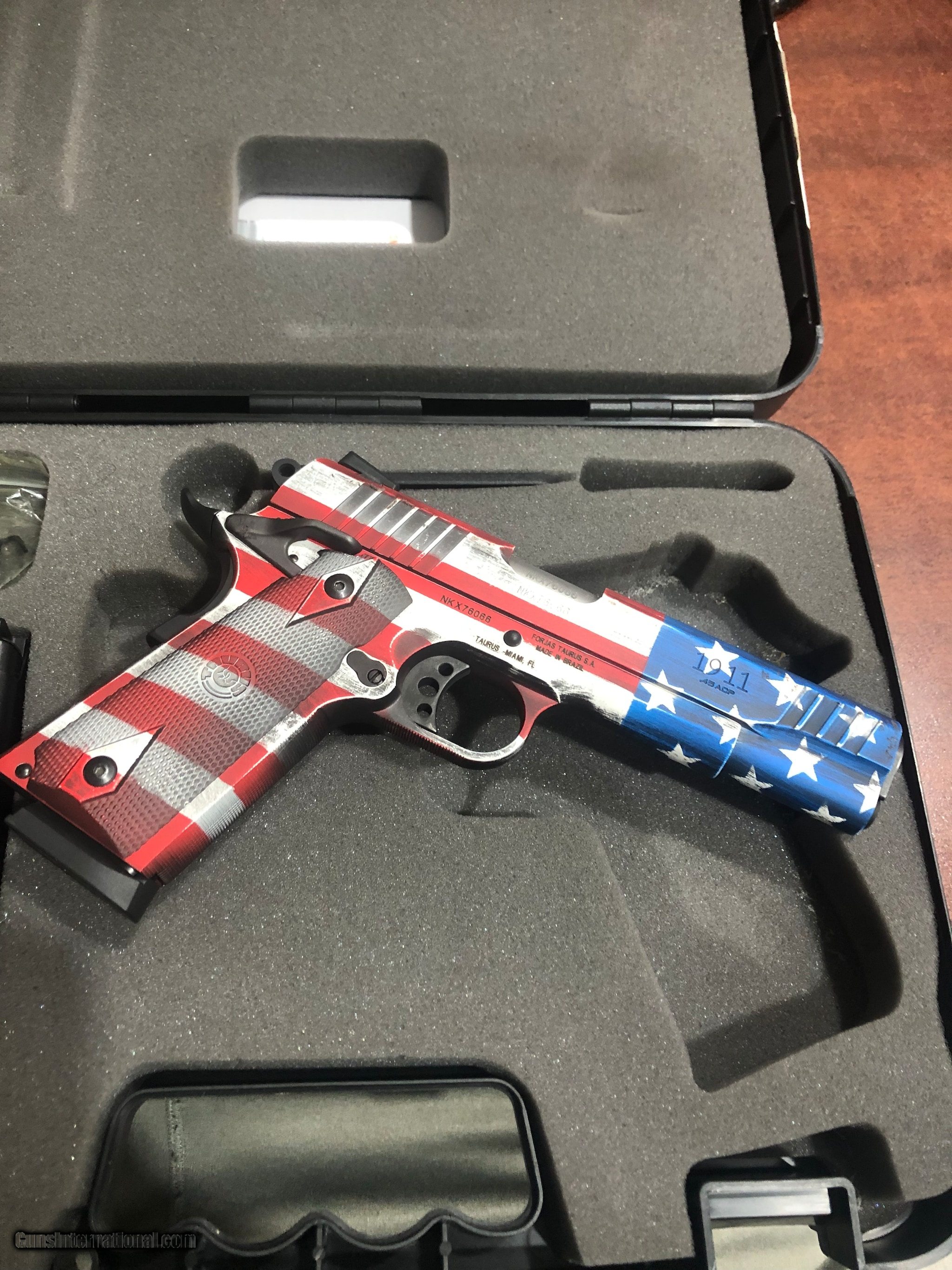 Description: Guns Listing ID: 806121 Taurus 1911 flag edition with three extra magazines. Excellent condition. SOLD Manufacturer: TAURUS Model: 1911 Caliber Info: .45 ACP Condition: Used - Non-Certified Barrels: 5 BARREL Finish: AMERICAN FLAG |