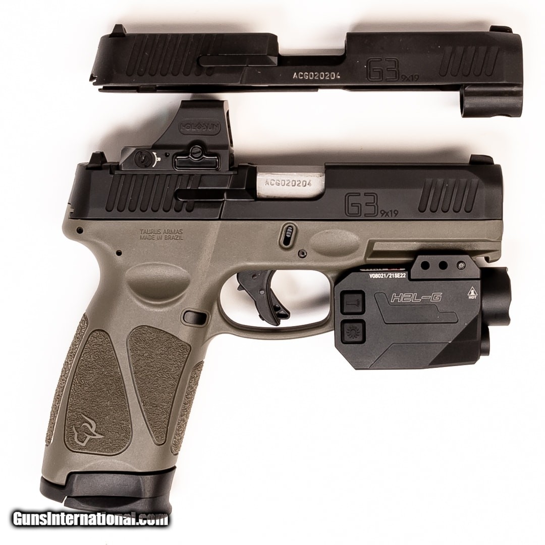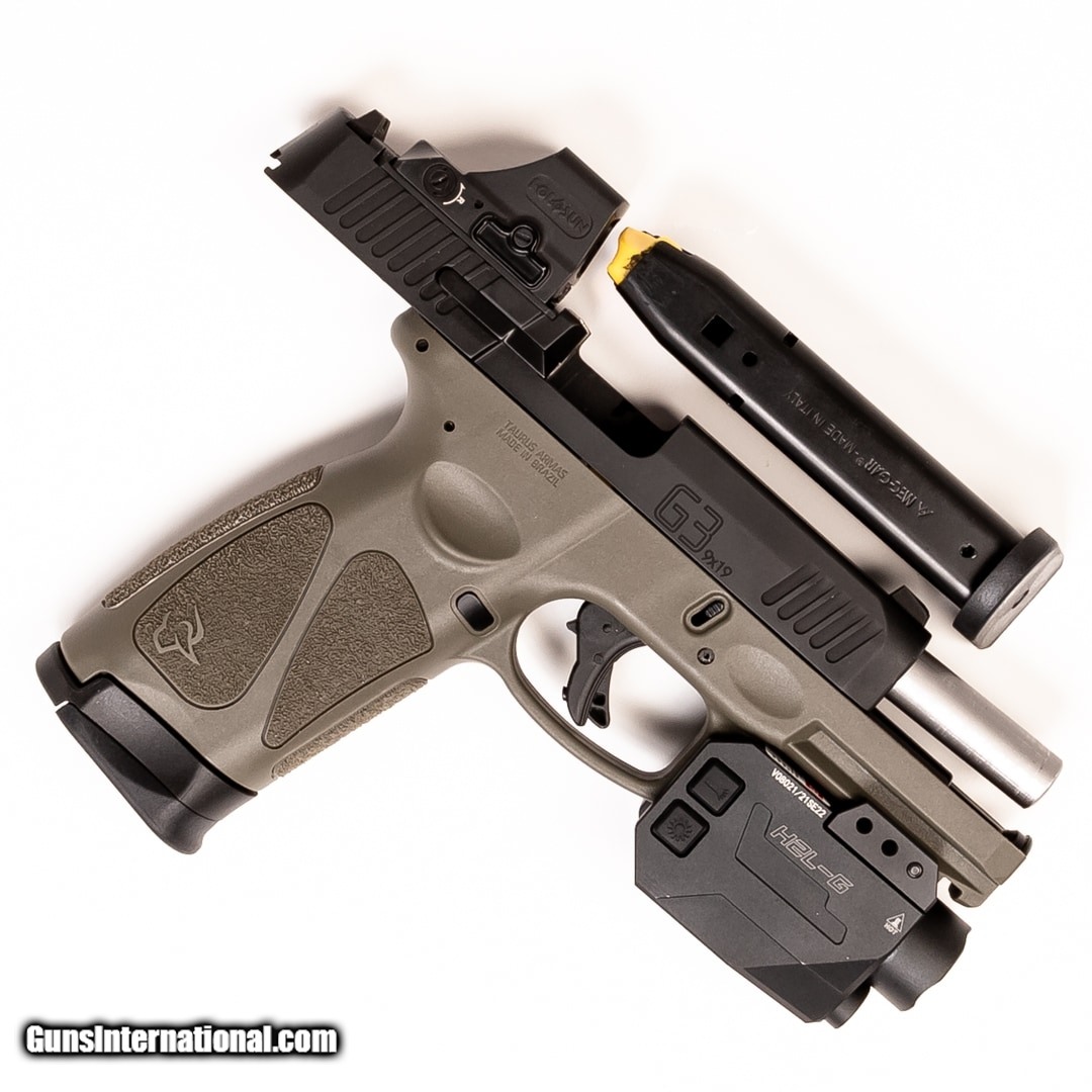 Description: Guns Listing ID: 463587 The Taurus G3 is a striker-fired semi-automatic handgun that is accurate and reliable. It makes an excellent self-defense sidearm with an easy-going price tag. This model has a G3 T.O.R.O. conversion kit with four optic plates and four different types of screws. It‚‚s also equipped with a Holosun HE508T-GR x2 and a Votatu H2L-G green laser/light combo with 1000 lumens and a magnetic chargeable cord. Purchase includes one 15-round magazine, one 17-round magazine, and the original slide SOLD Manufacturer: TAURUS Model: G3 Caliber Info: 9MM LUGER (9X19 PARA) Condition: Used - Certified Barrels: 4 BARREL Finish: OD GREEN |