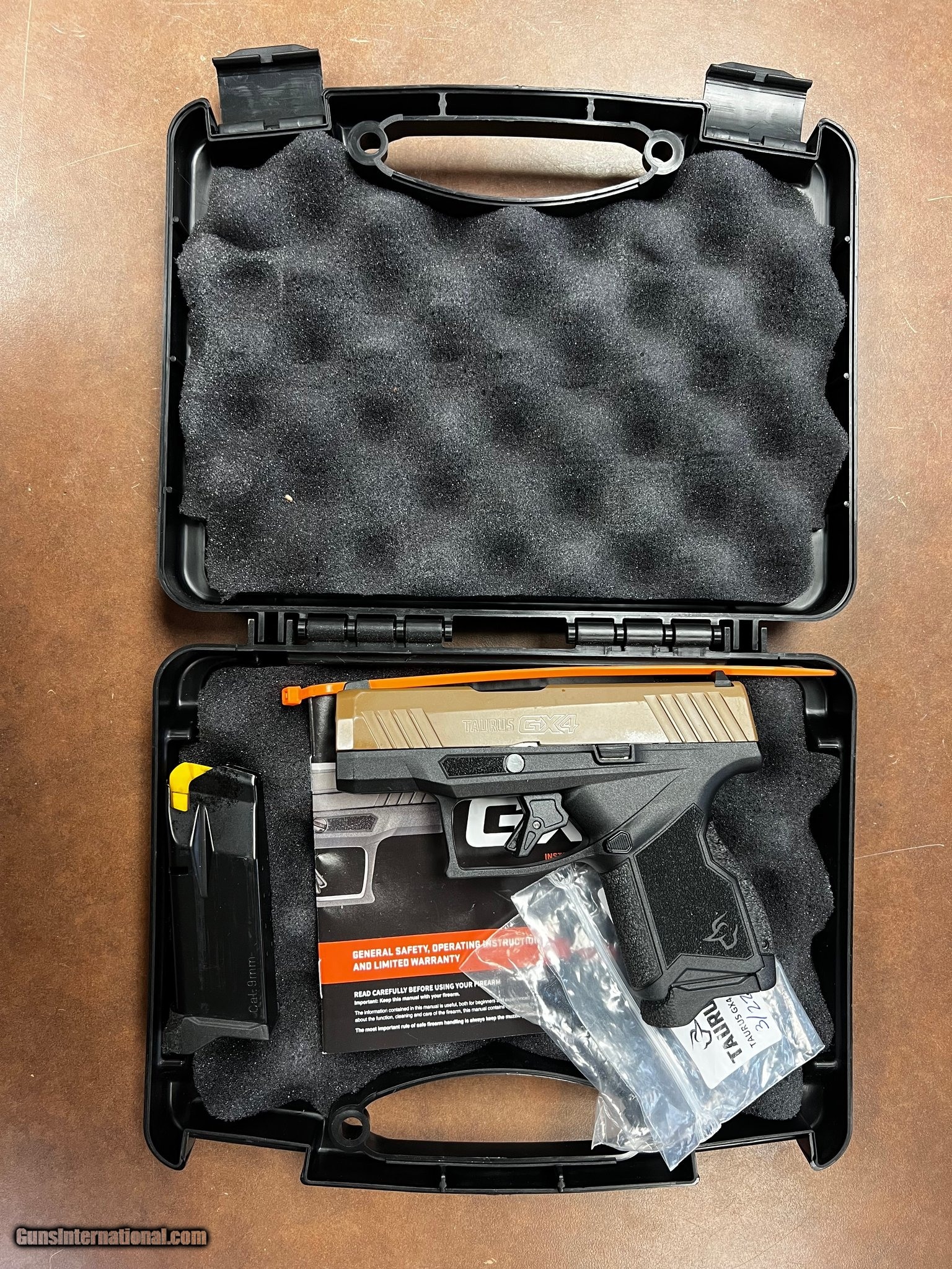 Description: Guns Listing ID: 484671 The Taurus GX4 9mm Pistol features semiautomatic action and a polymer grip. It also has a fixed front sight and a drift-adjustable rear sight. SOLD Manufacturer: TAURUS Model: GX4 Caliber Info: 9MM LUGER (9x19 PARA) Condition: Used - Non-Certified Barrels: 3 Finish: black/fde |