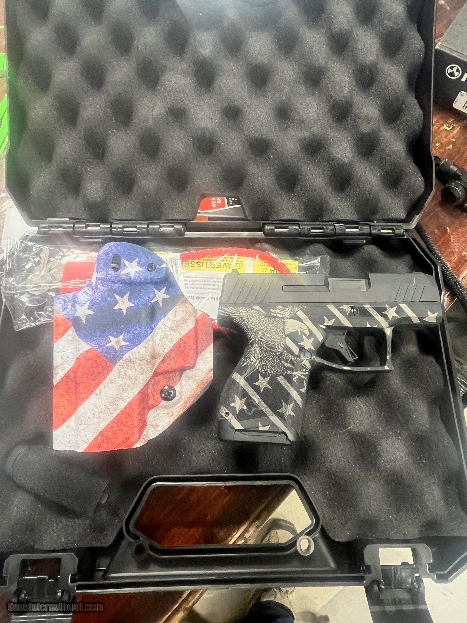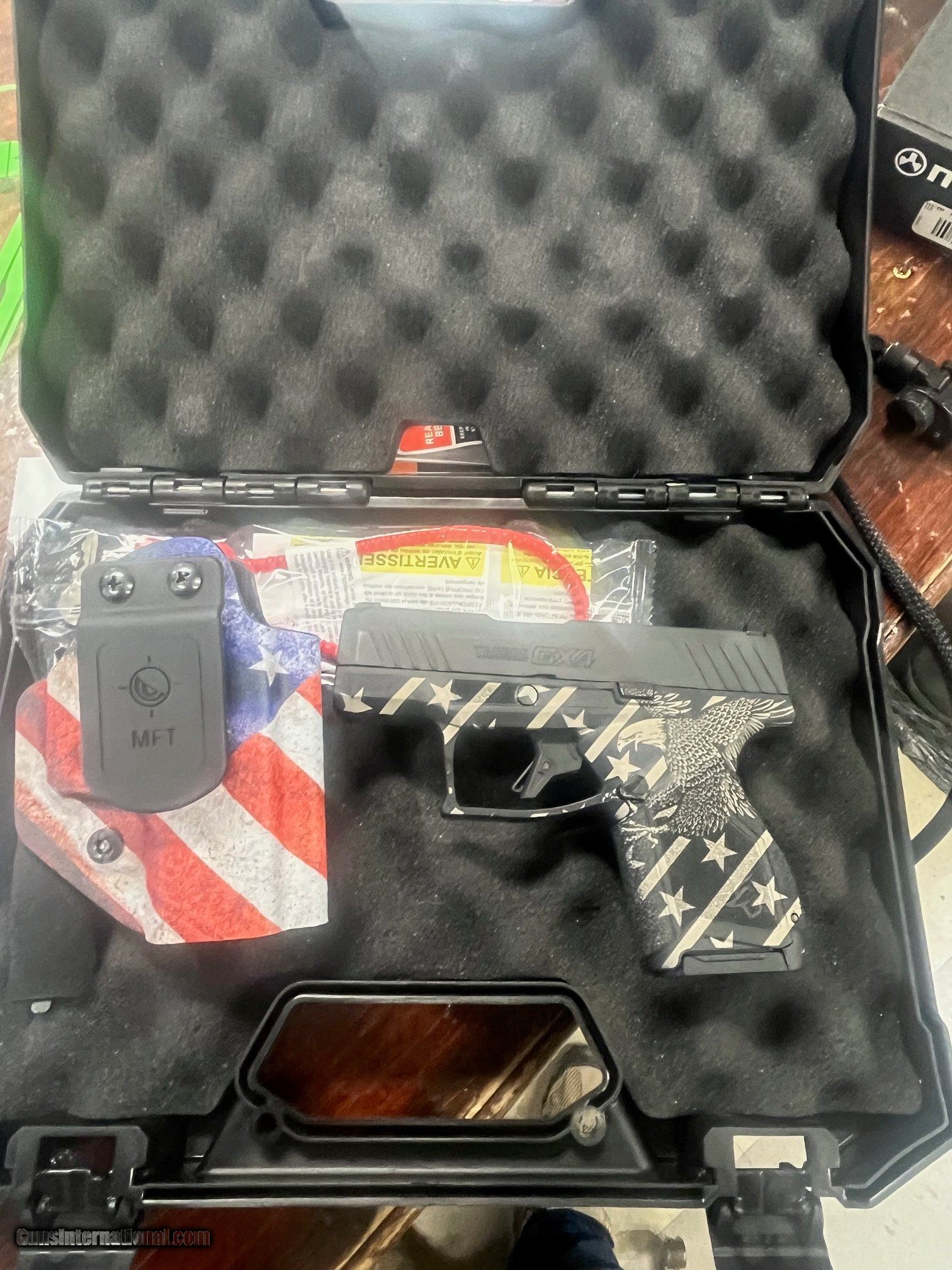 Description: Guns Listing ID: 491968 With one mag and case one backstrap and holster The Taurus® GX4 Micro-Compact Semi-Auto Pistol reaches new levels in concealed-carry engineering and ergonomics. Every inch of this streamlined, everyday-carry, micro-compact handgun is meticulously crafted for readiness and reliability. The GX4 boasts full-size capacity alongside an ultra-concealable 1\"-wide reinforced frame. For comfort, it features a flat-face, serrated trigger for enhanced comfort and control. The signature indexing and Recoil Management Pad (RMP) help increase accuracy while shooting quickly. The magazine and grip cuts make magazine stripping easy, and its Easy Take Down Pin lets you disassemble quickly. The Taurus GX4 features a steel alloy slide, stainless steel frame, and the barrel is stainless steel with a satin DLC coating. White dot front and serrated drift adjustable back sight. Visual loaded chamber indicator. Trigger safety. Ultra-concealable 1\"-wide reinforced frame Steel alloy slide and stainless steel frame Stainless steel barrel with satin DLC coating Flat-face, serrated trigger Signature indexing Recoil Management Pad Easy Take Down Pin SOLD Manufacturer: TAURUS Model: GX4 Caliber Info: 9MM LUGER (9x19 PARA) Condition: Used - Non-Certified Barrels: 2.75 Finish: AMERICAN FLAG/BLACK |