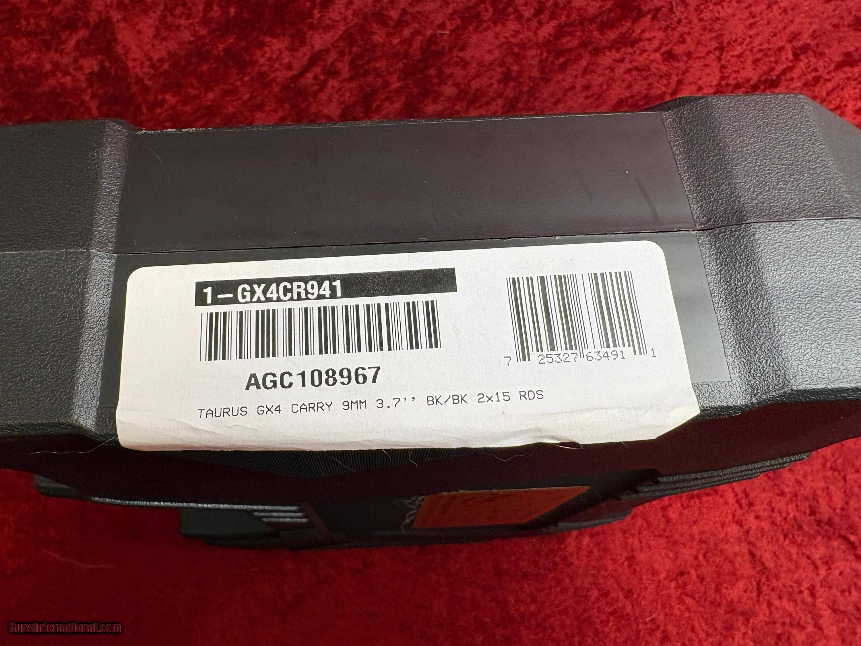 Description: Taurus GX4 Carry Compact Frame 9 mm semi-auto 15 rds 3.7" bbl #1GX4CR941 Great Conceal Carry pistol!! The Taurus GX4 Carry GX4 grip is ergonomic, which is enhanced by the three available backstrap options. The grip is designed by shooters for shooters and gives you maximum surface contact area in a small pistol. Featuring an Picatinny Rail MIL-STD-1913; serrated drift adjustable steel rear sight, white dot steel front sight; (RMP) signature indexing and recoil management pad; flat face, serrated trigger for better comfort and control; easy take down pin for disassembly; teflon-coated operational control parts; reversible magazine release and magazine and grip cuts to aid in magazine stripping if required. Includes two backstrap options and two magazines.