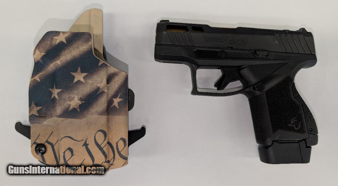Description: Guns Listing ID: 581857 Taurus USA, GX4 TORO, Striker Fired, Semi-automatic, Polymer Frame Pistol, Micro-Compact, 9MM, 3\" Barrel, Black Slide, Fixed Steel Front Sight, Drift-Adjustable Steel Rear Sight w/ Serrated Ramp, Optic Ready, (1)-13 Round Magazines, GOLD COLORED CEREKOTE BARREL. WE THE PEOPLE RH OWB KYDEX HOLSTER Firing System: Striker Front Sight: Fixed Steel White Dot Rear Sight: Serrated Drift Adjustable Slide Material: Steel Alloy Frame Material: Stainless Steel Barrel Material: Stainless Steel Frame Size: Micro-Compact Barrel Length: 3.06 in. Overall Length: 5.8 in. Overall Height: 4.4 in. Overall Width: 1.08 in. Weight: 18.7 oz Product Description Taurus is pleased to introduce the next iteration of its heralded GX4 micro-compact pistol, the Taurus GX4 T.O.R.O. The new GX4 T.O.R.O. adopts the Taurus Optic Ready Option mounting system, which facilitates mounting of several popular micro-red dot sights. The T.O.R.O. system is designed around a factory optic-cut slide for those who desire the advantages of a low-print EDC handgun and the confident sight picture of a red dot. The GX4 T.O.R.O. also comes with a flush-mount slide cover plate for use with the non-optic option. The Taurus GX4 series pistols lead the micro-pistol class with their 13+1-round capacity, durable finish, ergonomics, and exceptional accuracy. The Taurus GX4 offers minimal printing even when worn under light clothing yet delivers the firepower and performance serious personal defense practitioners demand in an EDC/CCW handgun. Manufacturer: TAURUS Model: GX4 CARRY TORO Caliber Info: 9MM LUGER (9x19 PARA) Condition: Used - Non-Certified Barrels: 3" BARREL Action: SEMI AUTOMATIC Finish: black Price: $299.99 Contact Seller |