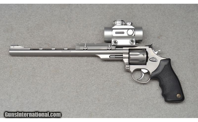 Description: Taurus Hunter revolver in excellent shape. In a hard to find caliber, this Taurus features a 12" barrel & red dot sight. Has minor carbon marks on the cylinder and handling marks. .218 Bee SOLD Metal Condition: Excellent Wood Condition: Excellent Bore Condition: Clean Barrels: 12 Weight: 3 lb 15 oz Sights: Barska Red Dot Item Location: Fort Worth, TX |